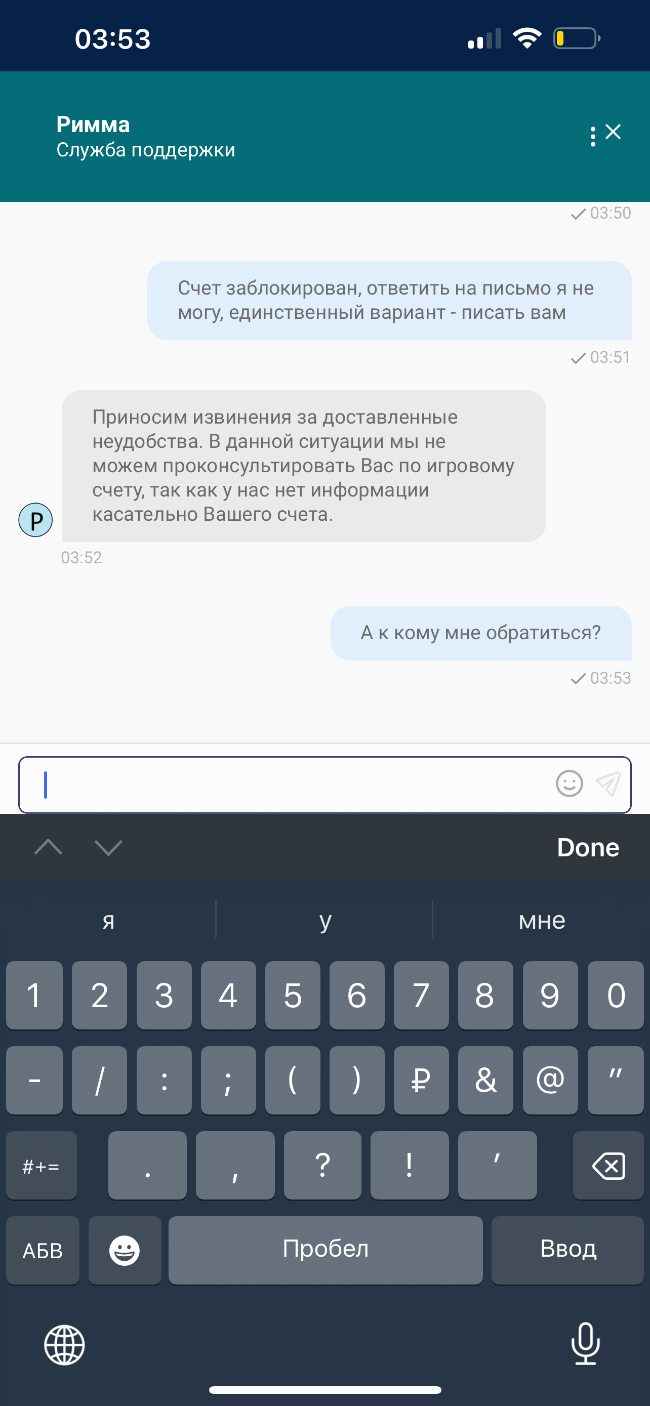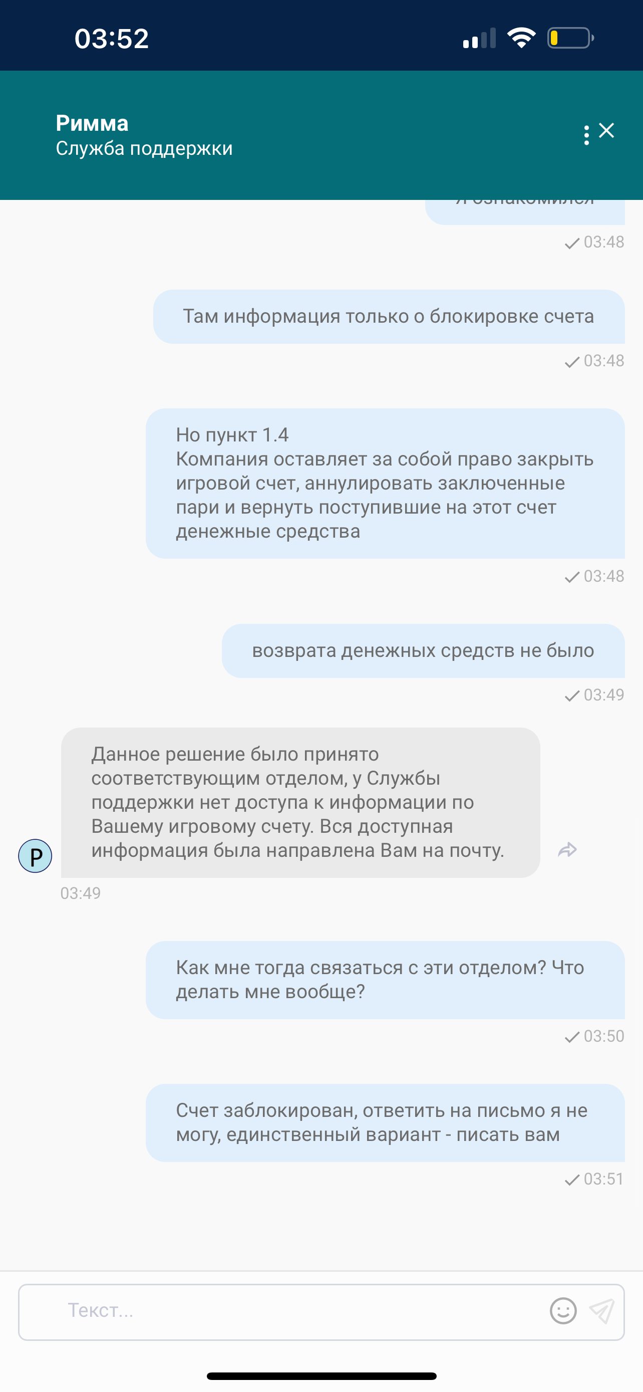 Здравствуйте! Я сделал несколько выигрышных ставок на футбол и баскетбол, помимо выигрышных были и проигрышные, ставки я делаю редко и особо не увлекаюсь этим, но поставил и повезло, сразу после зачисления на счет победных 6200 рублей, заблокировали вывод и попросили прислать документы, в первый раз паспорт и договор из банка, отправил сразу же им на почту, после нескольких часов пришло ещё одно письмо где они дополнительно просят прислать ещё 5 документов: 1. ещё одно подтверждение личности (выбрал вариант с свидетельством о рождении) 2. оригинал документа из банка с подтверждением адреса 3. фотографию с паспортом и цифрами на листке 4. фотография на оказание услуг связи по номеру телефона 5. выписку из банка с подтверждением платежейЯ заказал все нужные документы, в салоне связи договор на оказание услуг связи выдать не смогли, предоставили документ о подтверждении личности владельца номера телефона, номер телефона был оформлен на моего отца, пользуюсь я им давно и оплачиваю его тоже я со своей карты, другого номера телефона у меня нет, но и салон связи подтвердил что владелец я, переоформили на меня, я позвонил в поддержку и уточнил все эти моменты, в поддержке оператор Максим сказал что постараемся решить и нужно для начала загрузить все документы, сразу же после звонка я начал фотографировать все документы и мне сразу же пришло письмо о том, что мой счет заблокирован по правилам 1.6.4., выглядит все очень странно и смешно, все документы у меня на руках, я ничего не скрываю, ставлю сам, пользуюсь бк тоже только я, но мне даже не дали возможность прислать им эти документы и перерассчитали все ставки с коэффициентом «1» - что это значит я тоже не понял, в поддержке сказали что помочь ничем не могут, прошу помочь в этом вопросе legalbet
