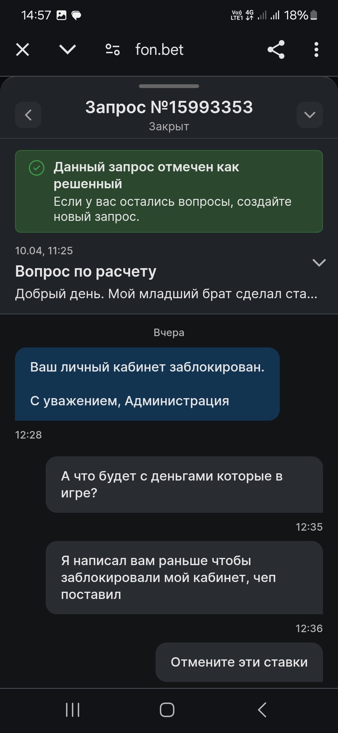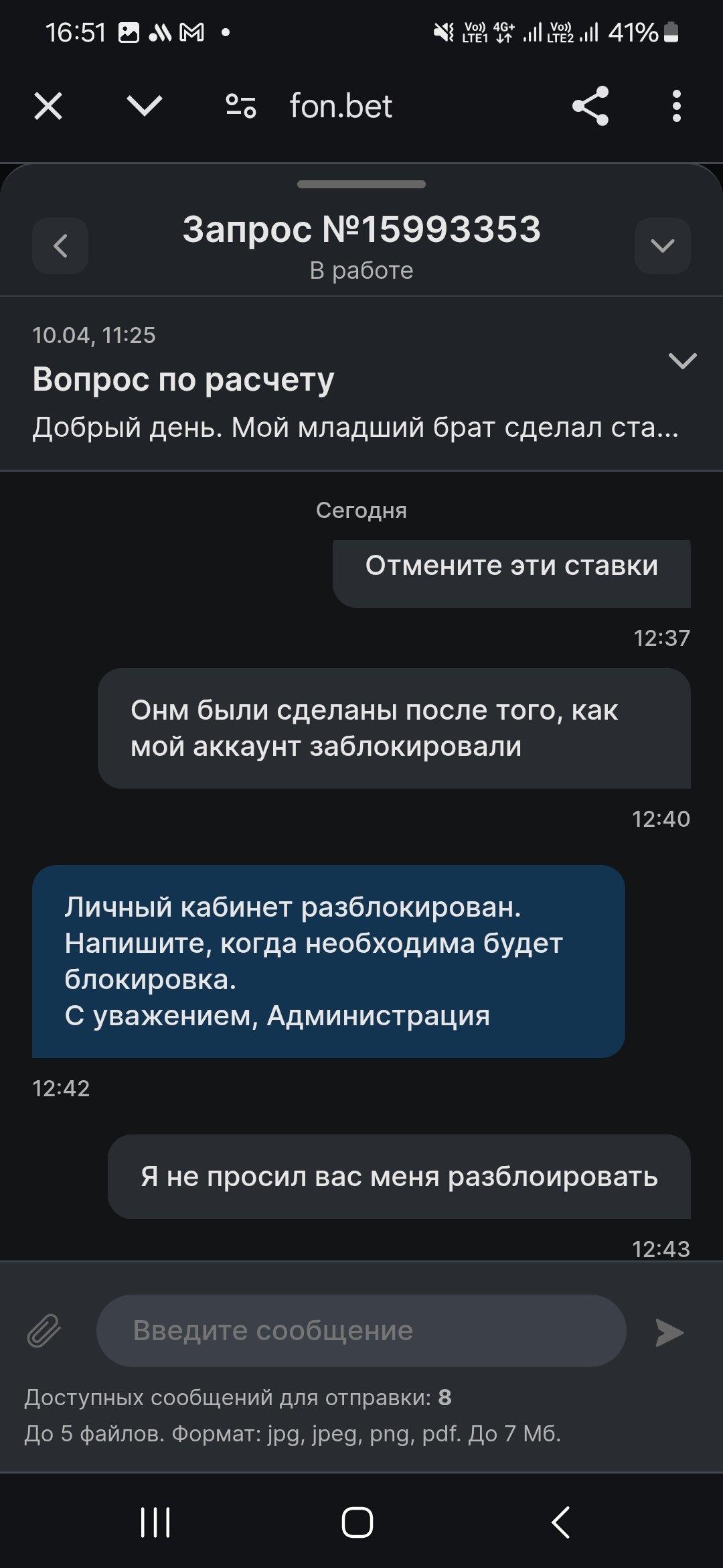 Неделю назад сделал обращение к администрации fonbet с просьбой блокировки аккаунта, чтобы я не смог делать ставки т.к зависим. Администрации меня заблокировала, но через 12 минут без моего обращения разблокировала мой аккаунт и я смог сделать 2 ставки. По условиям соглашения администрация может разблокировать аккаунт только в случае обращение с просбой о разблокировкн самого владельца аккаунта. Я никакого обращения не делал, они разблокировали меня самовольно тем самым нарушив соглашение. Я поставил после этого 2 ставки по 6000 и 3000 и проиграл. Прошу анулировать ставки, т.к должен был быть в блокировке. Администрация мои обращения игнорирует и признаыать свою вину не хочет. Они не имели права разблокировать мой аккаунт без моей просьбы