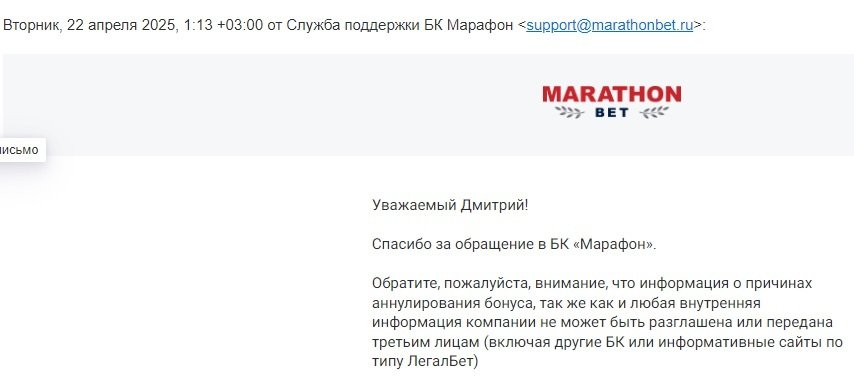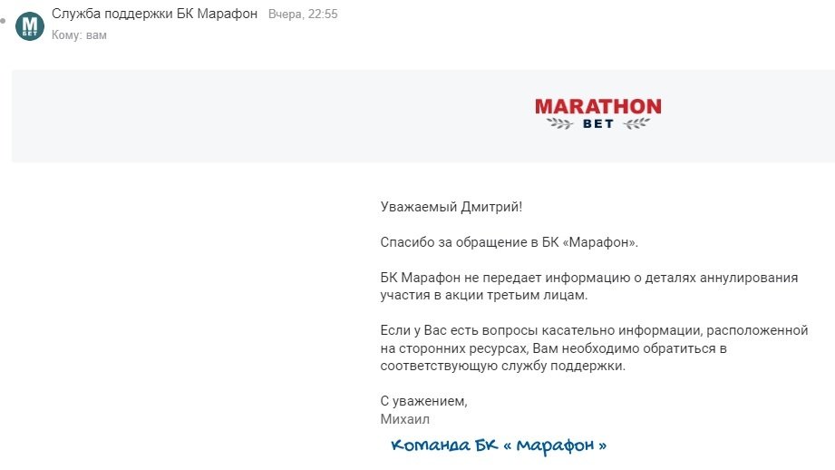 Здравствуйте, уважаемая редакция сайта Легалбет!Произошел неприятный случай, увидел рекламу букмекера Марафон и то, что букмекер предлагает бонус 5000 в мобильном приложении, меня бонус заинтересовал и я решил зарегистрироваться и внести депозит. После успешного внесения денег с промокодом я увидел в личном кабинете полосу отыгрыша бонуса, нужно было сделать ставок минимум на 5000 р, я сделал две ставки, обе на хоккей, обе ставки зашли и тогда я начал искать этот самый бонус в виде фрибета, в разделе бонусы фрибет есть и написано, что он начислен и можно его использовать, но использовать его не получилось, тогда я написал в поддержку и получил ошеломляющий ответ, оказывается я вел себя некорректно и поэтому букмекер не дает мне возможность поставить этот бонус, хотя он доступен! Я так понял это какой-то новый вид развода у букмекер, давать рекламу и заманивать новых игроков этим бонусом, ждать когда игрок внесет деньги и проиграет их, а далее писать эту чушь? Прошу разобраться в этом случае, спасибо за внимание.