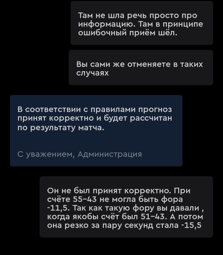 В принятом пари стоит счёт на момент приёма 51-43. Но такого счёта не было. Они ссылаются на якобы неточности. Но сами же в таких случаях расчёт делают возвратом, говоря , что имело место ошибка в процессе приёма пари.