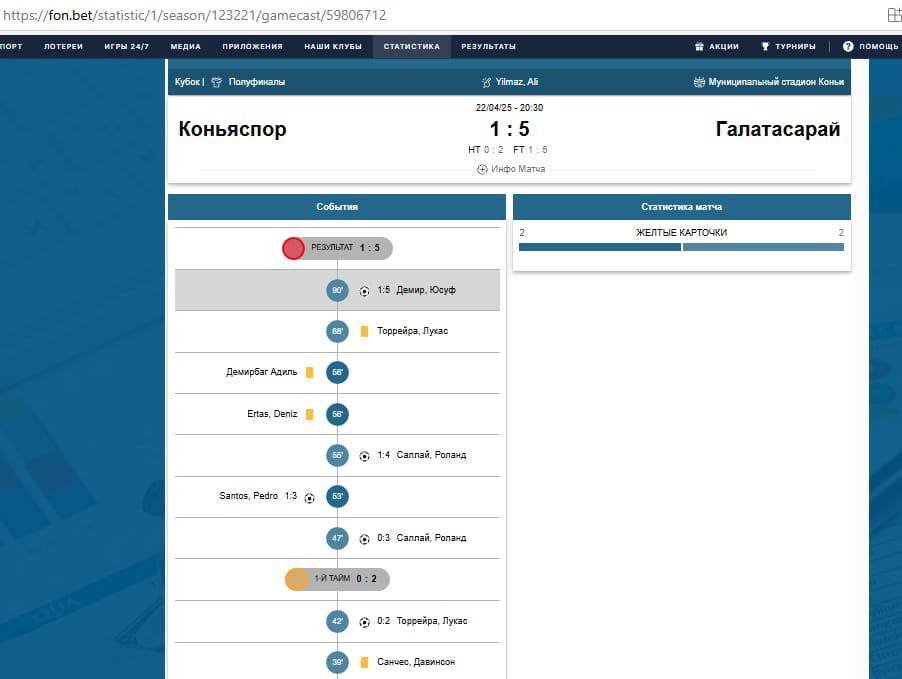 Прошу произвести правильный расчет желтых карточек в матче кубка турции по футболу Коньяспор-Галатасарай, который прошел . Согласно официальному источнику Федерации Футбола Турции , который указан у вас на сайте в списках источников информации в матче было показано 4 желтых карточки. У вас на сайте Фонбет в разделе статистка также указано 4 желтых карточки! Только лишь в результатах 3 желтые карточки. Прикладываю скрин с вашего сайта с раздела «источники информации при проверке результата», где вы указываете сайт в качестве официального источника! Прикладываю также скрины с официального источника, указанного на вашем сайте, а также с раздела «статистика» вашего официального сайта! Прошу произвести правильный расчет желтых карточек! Скрины прикрепить не могу