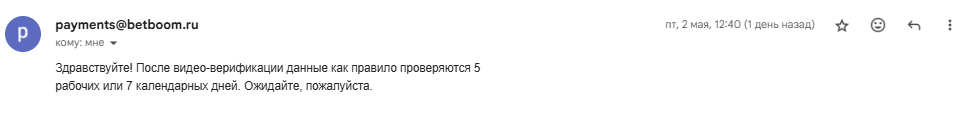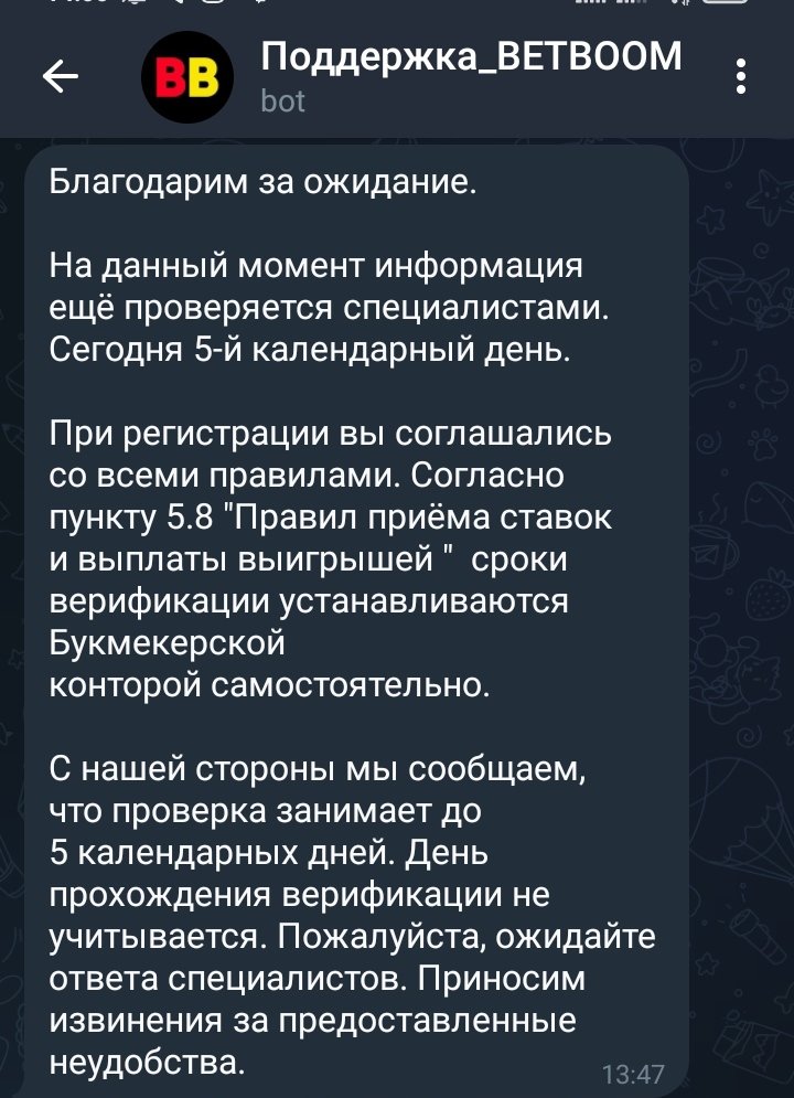 На подходе вторая неделя прямого игнорирования своих обязательств от мошенников. По сути они заморозили мои деньги без каких либо оснований игнорируют прямые вопросы, в поддержке отвечают заготовленными методичками, на вопрос что они могут проверять 10 дней в документах, которые я отправил им уже во второй раз за последние полгода и видеозвонке не дают никаких ответов. Просто берут и не выплачивают выигрыши, в связи с какими то проверками, что конкретно хотят проверить — не ясно, не отвечают. Теперь выясняется, что никаких регламентированных сроков нет и проверять они их могут 180 дней (исходя из их "правил"). Очередная копипаста пришла вчера с их почты, никаких деталей почему проверка затягивается настолько, просто ожидать. Я видел что через арбитраж люди согласовывали звонок и в тот же день получали возможность вывести деньги. Помогите мне разобраться в этой ситуации. Никаких мультиаккаунтов у меня нет, правил я не нарушал, личность подтвердил, всем их условиям следовал. По сути они заморозили мои деньги на неопределенное кол-во дней без каких либо оснований и отказываются решать вопрос.