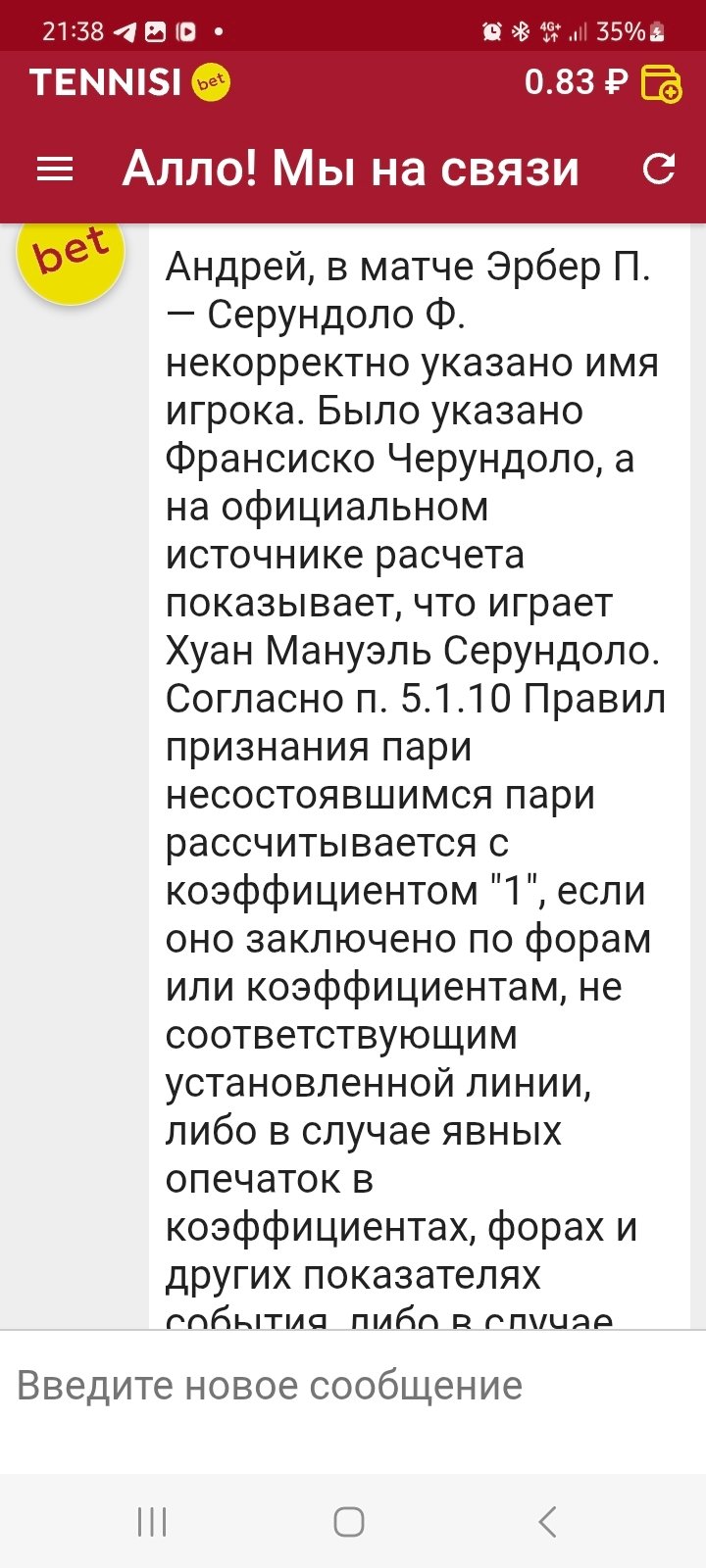 Поставил на теннисный матч Эрбер - Серундоло. На победу второго. В других конторах мне рассчитали победу. Но в этой конторе матч рассчитали возвратом (неверно указано название одной из команд). В поддержке сослались на пункт . что не является по моему мнению причиной возврата. Большая просьба разобраться в этой выпиющей несправедливости. По моему мнению бук просто не хочет платить.