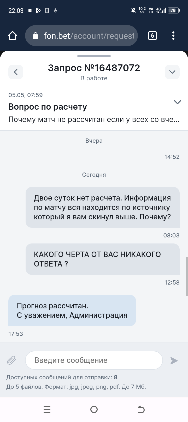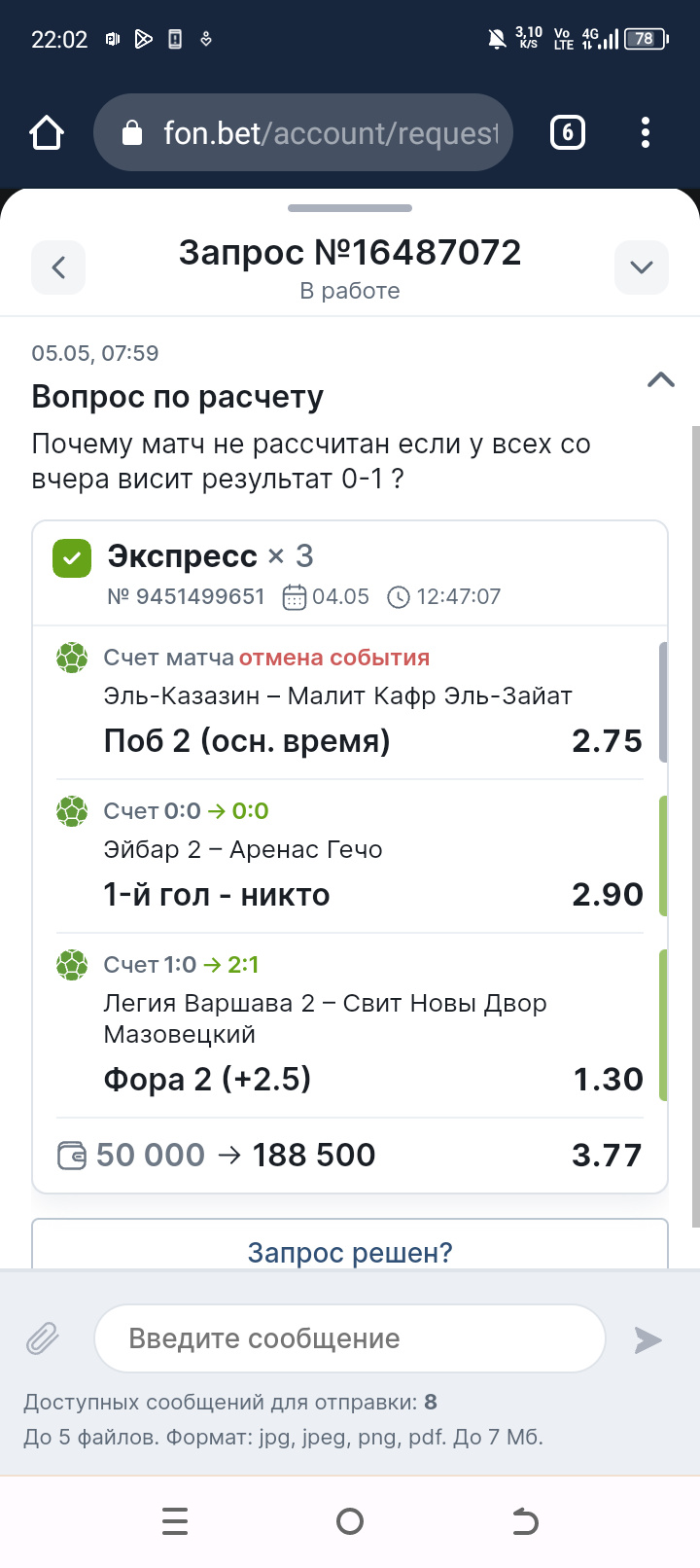 Сделал ставку 9451462411. Экспресс на 2 события. Одно из них чемпионат Египта второй лиге,на скриншоте. После завершения события Фонбет долго не рассчитывал. Я создал запрос,спросил почему,ответили,что результат уточняется. На следующий день результат появился во всех БК,но Фонбет не рассчитывал. Я зашёл на официальный Фейсбук одной из команд и через арабский переводчик увидел посты,что матч состоялся, счёт 0-1, в эту же дату,в это же время. Там сотни комментов,там даже видео эмоций команд и даже 20 минут матча. Всё это доступно и сейчас по ссылке Я спросил у Фона ещё раз,почему нет расчета. Снова не ответили. И через двое суток дали возврат по матчу. Как вообще такое возможно? Результат есть во всех БК. Вся информация, абсолютно любая по матчу есть в официальном Фейсбуке. На каком основании возврат ?