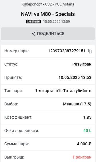 1. Пари 1239732387279151 Расчет - проигрыш, хотя по официальным данным, ровно как и в самой игре видно, что b1t сделал 17 убийств. Ответ поддержки - 2. Пари - 1238220507805737.На этот раз возврат с причиной Хотя ставка была сделана до начала карты.