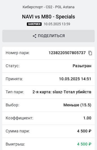 1. Пари 1239732387279151 Расчет - проигрыш, хотя по официальным данным, ровно как и в самой игре видно, что b1t сделал 17 убийств. Ответ поддержки - 2. Пари - 1238220507805737.На этот раз возврат с причиной Хотя ставка была сделана до начала карты.
