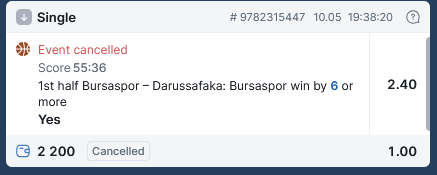 Добрый день Вам. Отменили, как всегда выигрышную ставку. Выплата с коэффициентом . Even Cancelled - это отмена события, но матч начался вовремя с соответствии с заранее запланированным графиком. 2200 * = 2200. Сделано. 2200 * = 5280. Отсутствует. Недостача - 5280 - 2200 = 3080.
