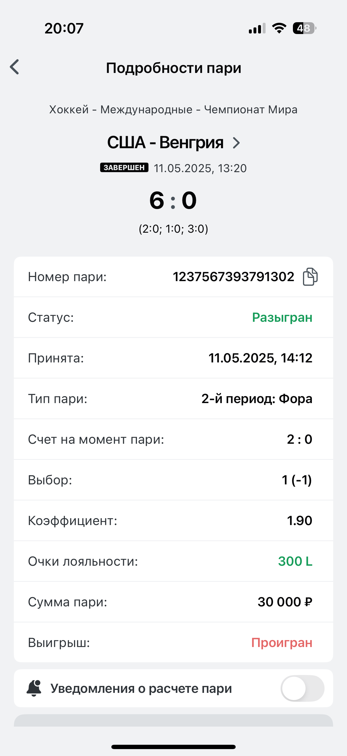 Здравствуйте, сделал ставку на матч США Венгрия на 2-й период победа США во втором периоде с учетом форы 1 (-1). Второй период закончился со счетом 1:0, соответственно должен был быть возврат, а БК рассчитало как проигрыш. На мой запрос по поводу неправильности расчетом заявляют что рассчитано верно, так как не предложена была ничья. Про это условие слышу впервые. В правилах БК нет никакой информации по поводу такого условия. Я так понимаю БК намеренно ввела в заблуждение или не правильно рассчитало пари.