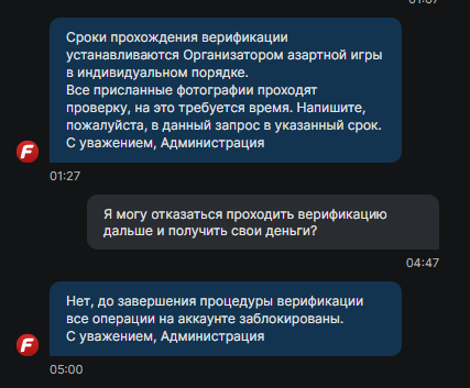 Здравствуйте, клиентом фонбета являюсь более 10ти лет. Пополнений за всё время было совершено на 15 млн рублей. Имею VIP статус. Жалоба. Компания Фонбет специально затягивает процесс верификации, не выплачивает средства, я делал обычные ставки, немного увеличил суммы ставок, вышел в плюс и мне заблокировали аккаунт и вывод средств, написали что проходит процедура верификации, попросили прислать 4 разных фотографии паспорт, разворот паспорта, фото паспорта на просвет, фото паспорта на фоне переписки. После чего они написали "Напишите нам после 20-00 (МСК) в данном запросе". я им написал и мне сказали прислать фото моих карт с паспортом и моё фото с паспортом и картами в руке. Я отправил им данные фото. Теперь они пишут "О ходе процедуры верификации просим самостоятельно уточнить через 7 суток 20 мая после 00-00 МСК в данном Запросе". Это еще 7 суток. Итого получится я не могу пользоваться счётом и выводить свои деньги минимум 14 дней. Скорее всего еще что-то запросят и так же будут "проверять" 7 суток. Специально затягиваю процесс и будут просить по одному документу каждые 7 суток. На мои попытки с просьбами ускорить верификацию отвечают однотипно "напишите через 7 суток" и всё. Я готов отказаться от прохождения этой бесконечной верификации и получить выплату моих денег. Пользоваться данной БК после таких проблем больше не планирую. Считаю данные действия со стороны БК Фонбет неправомерными, прошу разобраться в моём вопросе. Заранее спасибо.