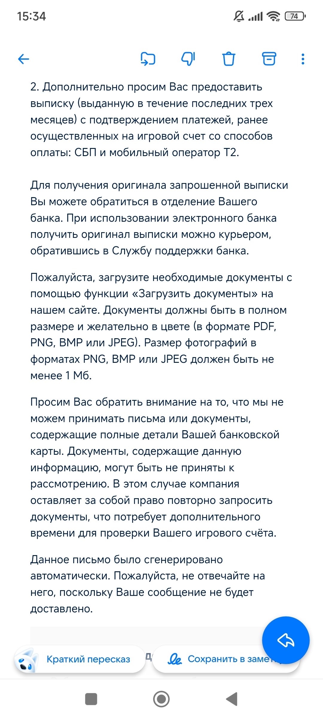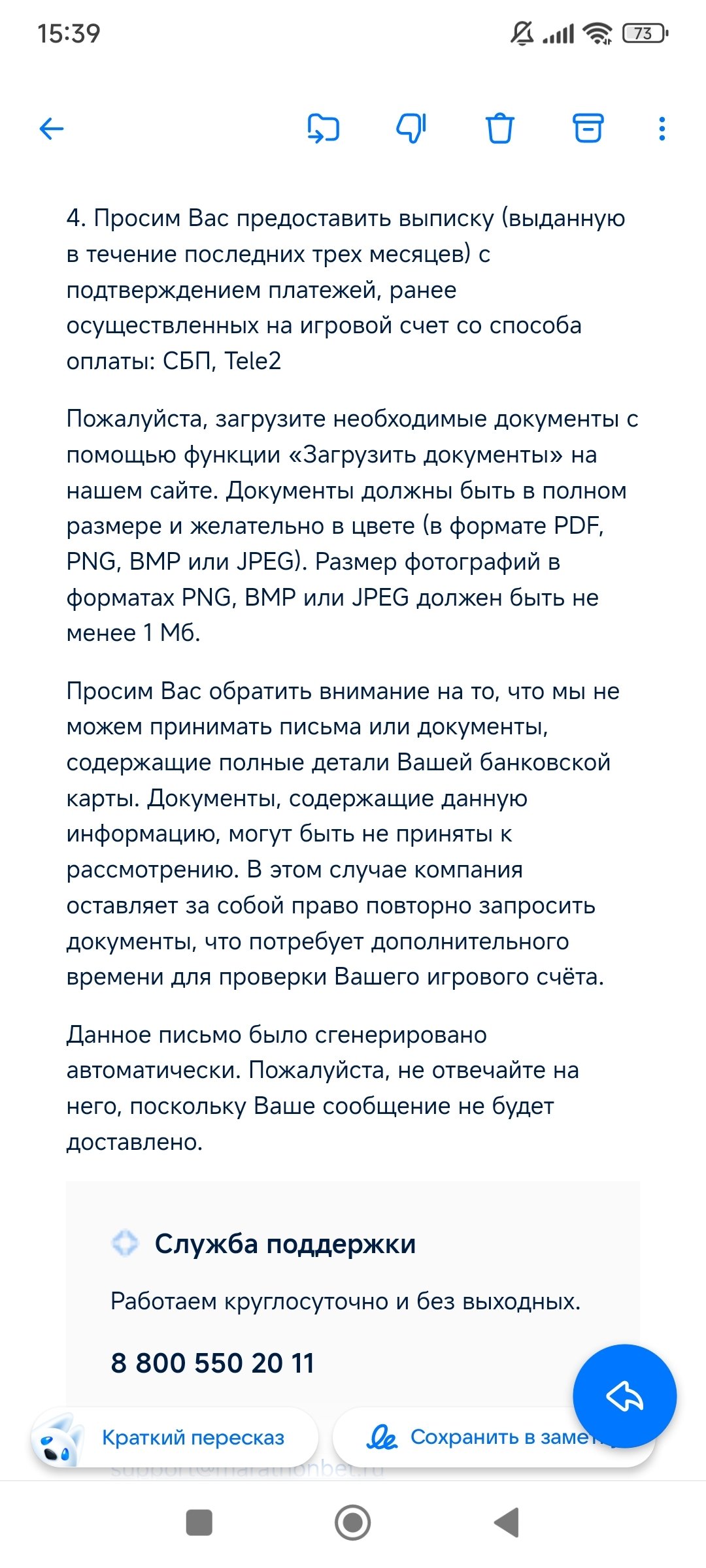 Добрый день! Помогите, пожалуйста, возникла такая проблема, несколько раз ставил на БК Марафон до этого, пришло уведомление о доступном фрибете при пополнении. Пополнил счет на 2258 рублей и получил фрибет в 1000. Поставил две ставки, одну на деньги, другую на фрибет. Фрибет проиграл, на деньги выиграл. Попытался вывести средства и мне заблокировали вывод сославшись на проверку, которую они иногда проводят среди клиентов, почему я попал под неё непонятно, ведь у меня есть верифицированный ЦУПИС, а также при регистрации на Марафон я проходил полную верификацию. Прислали такое письмо на почту: Здравствуйте, Всеволод!Благодарим Вас за интерес к БК «Марафон».Иногда мы проводим проверку безопасности на счетах наших клиентов. Ваш игровой счет был случайно отобран для проведения этой процедуры.Для проведения данной проверки, пожалуйста, предоставьте нам фотографии оригиналов документов, которые могут подтвердить:1) Вашу личность. В качестве такого документа Вы можете предоставить нам (два из списка):страницу внутреннего паспорта с фотографией (с серией и номером);страницу заграничного паспорта с фотографией (с серией и номером);водительское удостоверение;военный билет (может быть принят только как второй документ, удостоверяющий личность);свидетельство о рождении (может быть принято только как второй документ, удостоверяющий личность).2) Ваш адрес. В качестве такого документа Вы можете предоставить нам (один из списка):банковский договор (договор вклада, кредитный договор, договор об открытии счёта, договор о комплексном банковском обслуживании);справку из банка (справку об открытии/наличии счёта, справку об ипотеке, заявление на открытие банковского счёта, заявление на выпуск банковской карты);квитанцию на оплату коммунальных услуг (к квитанции необходимо приложить чек или штамп об оплате);адресную справку о регистрации по месту жительства.В документе должны быть отчетливо видны Ваши Ф. И. О., дата выдачи, адрес Вашего проживания, печать организации и подпись сотрудника, выдавшего документ. Также он должен быть не старше трех месяцев.Пожалуйста, загрузите необходимые документы с помощью функции «Загрузить документы» на нашем сайте. Документы должны быть в полном размере и желательно в цвете (в формате PDF, PNG, BMP или JPEG). Размер фотографий в форматах PNG, BMP или JPEG должен быть не менее 1 Мб.Просим Вас обратить внимание на то, что мы не можем принимать письма или документы, содержащие полные детали Вашей банковской карты. Документы, содержащие данную информацию, могут быть не приняты к рассмотрению. В этом случае компания оставляет за собой право повторно запросить документы, что потребует дополнительного времени для проверки Вашего игрового счёта.Данное письмо было сгенерировано автоматически. Пожалуйста, не отвечайте на него, поскольку Ваше сообщение не будет доставлено.Мало того, что требования какие-то странные, например, паспорт с печатью о регистрации им не подойдет, хотя я его отправлял, им нужен либо банковский договор, который я получал 10 лет назад, когда открывал карту, а копию его не дают, либо квитанция об оплате, либо выписку из адресной книги, что невероятный бред, так еще все эти документы должны быть физическими и обязательно с печатями и подписями. По итогу я предоставил документы, после этого началась полная жесть, каждый 