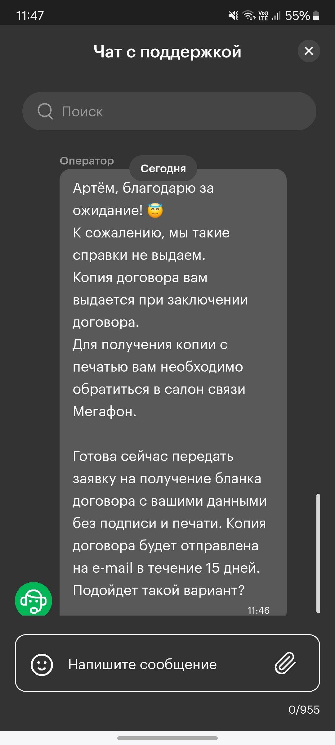 Да зачем вы в поддержку пишете? Сходите в ближайший офис Мегафона и попросите либо справку о счете с печатью, либо справку о заключении договора (ее и без печати принимают).
