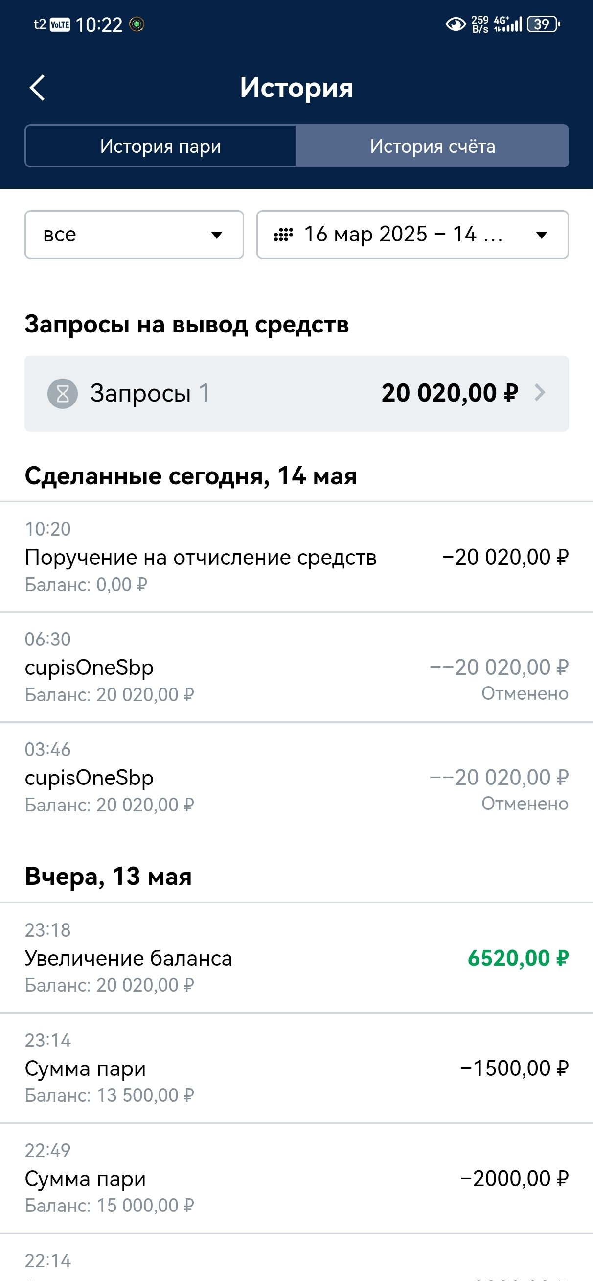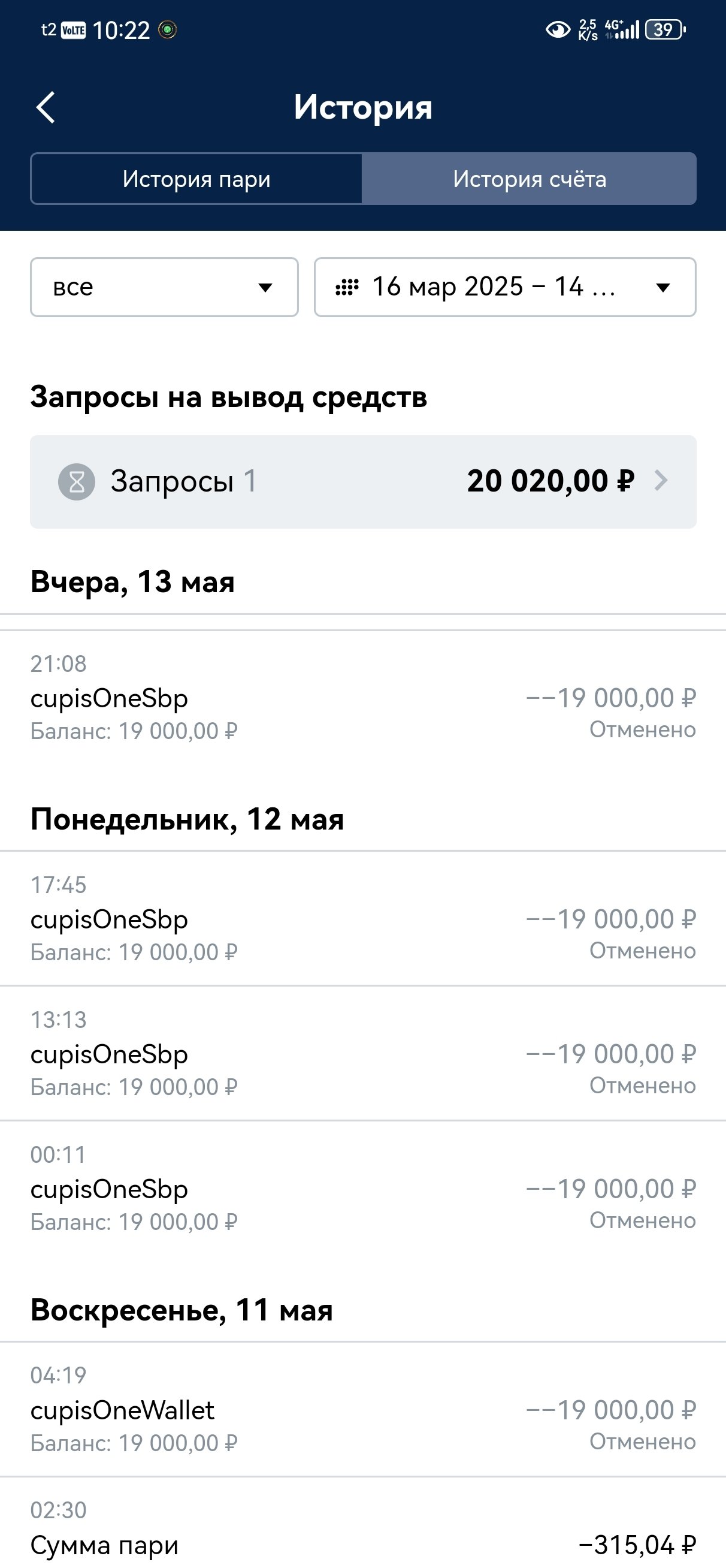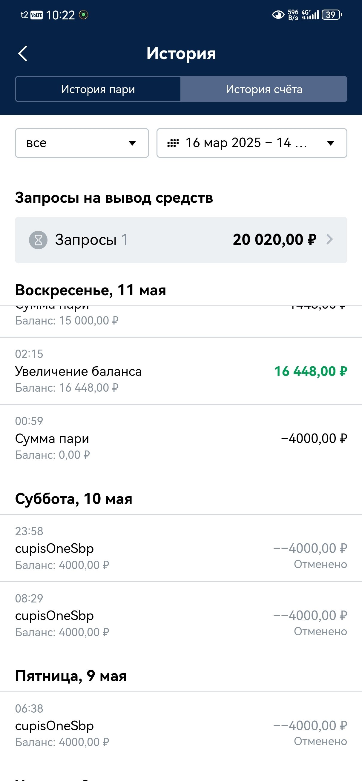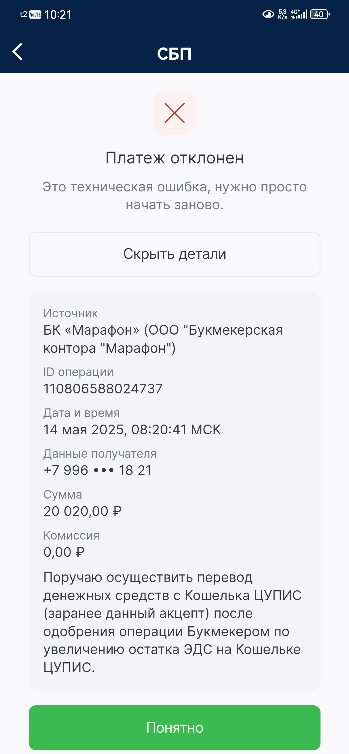 Добрый день, помогите , пожалуйста. Проблема длится уже 5 дней. Хотел вывести 4000р в самый первый раз, но почему то ещё в приложении БК после ввода кода от цупис о выводе, сразу идет отказ. Пробовал так каждый день, всегда отказ и деньги возвращали на баланс. По итогу сейчас 20 020р на вывод, который тоже не одобряют.Сторона БК говорила о сбоях и технических проблемах с выводами. После тогда как я сказал о том , что почему другим клиентам вы выводите? ( выводил друг 35000р)Они перефразировали и сказали , что есть у некоторых пользователей такие проблемы и частичные отказы, до этого говорили вообще не выводят и проблемы. НО!!? После каждого запроса на вывод и отказа, приходит письмо от них на почту, где сказано. Что проблема возникла со стороны ЕЦупис. Звонил им, записывал разговор. Они говорят мы видим каждый Ваш запрос и одобряем, но сторона БК марафон сама отменяет его. На почту так же каждый раз приходит от них сообщение, что Ваш БК отменил.Такая проблема длится уже 6 почти день. Не верю, чтобы такая крупная компания не могла решить это за сутки. При выводе так же идёт отказ и письмо на почту. Техническая проблема, не ставьте на вывод, попробуйте позже, как решим проблему, но когда не известно..Никакие правила их не нарушал. Ставлю там уже около 5 лет. Таких проблем не возникала.
