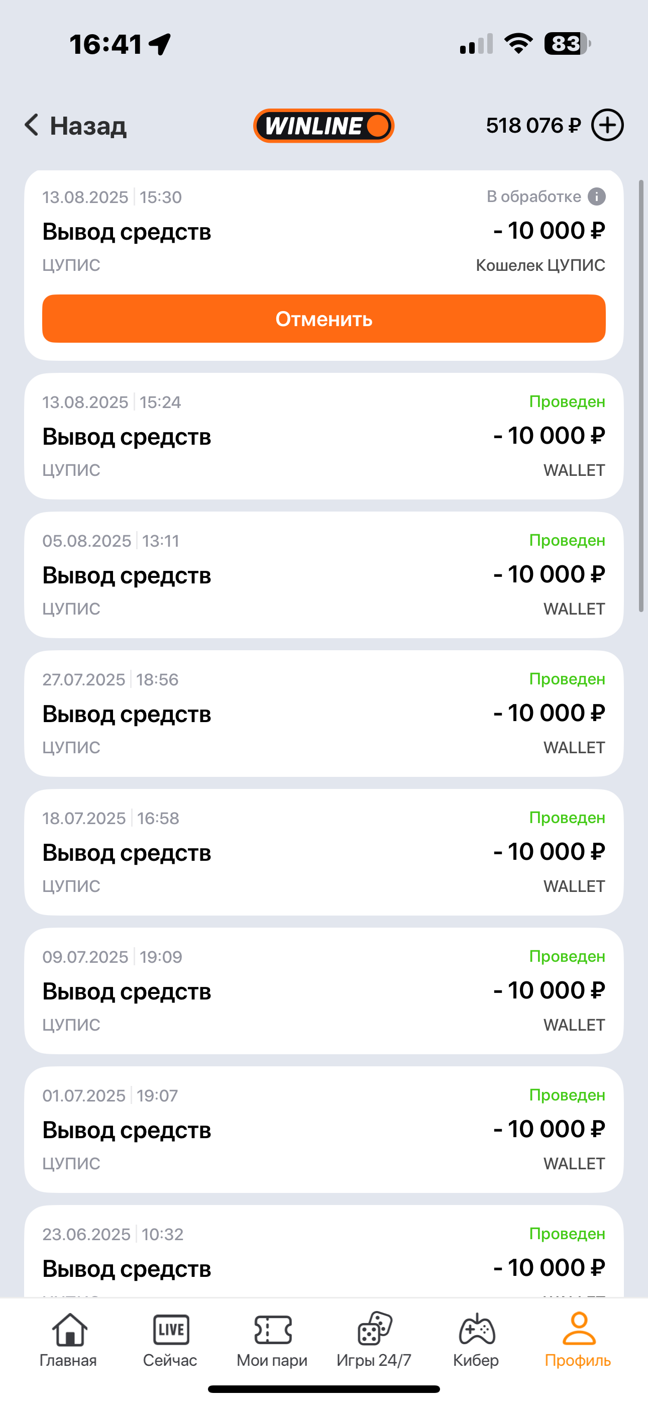 Здравствуйте, команда Legalbet. Пишу вам с жалобой на действия букмекерской компании Winline, которая, на мой взгляд, необоснованно затягивает процесс верификации и блокирует вывод моего выигрыша. Описание ситуации: Мой аккаунт был заблокирован после того, как на нём оказалось 623 076 рублей. Я сделал два экспресса по 50000 рубля, каждый из которых содержал по 3 события. После блокировки мне предложили пройти повторную верификацию, которую я прошёл успешно. В том числе я уже предоставлял справку для подтверждения номера телефона, как это было ими запрошено. Они подтвердили её получение. Однако позже Winline выдвинул дополнительное требование — повторно подтвердить номер телефона, но уже другим способом. Теперь просят предоставить: «Справку из Личного кабинета МТС — Лицевой счёт абонента МТС на номер, указанный при регистрации. Документ нужно получить на сайте МТС в разделе Мобильная связь → Детализация и счёт → Счёт на оплату за любой предыдущий месяц, и отправить на почту ». Проблема в том, что документ от МТС не содержит ФИО, о чём мне сообщили сотрудники МТС в официальном порядке. Таким образом, я не могу предоставить справку в требуемом формате, поскольку МТС просто не выпускает такие документы с указанием имени владельца. Получается, что я уже один раз подтвердил номер телефона справкой, которую у меня запросили. Но теперь Winline требует документ, который технически невозможно получить с нужными данными, из-за чего я лишён доступа к собственным средствам. Прошу Legalbet вмешаться в ситуацию и повлиять на действия букмекера. Мои требования: Прекратить запрашивать повторные, заведомо невыполнимые документы; Принять альтернативные способы подтверждения владения номером (договор с оператором, скриншот из личного кабинета, детализация с ФИО и т.д.); Разблокировать мой аккаунт и произвести выплату 623 076 рублей. Готов предоставить все подтверждающие материалы, включая справку, которую я уже отправлял, переписку с Winline и подтверждение от МТС. Заранее благодарю за помощь. С уважением, Кауров Евгений Андреевич