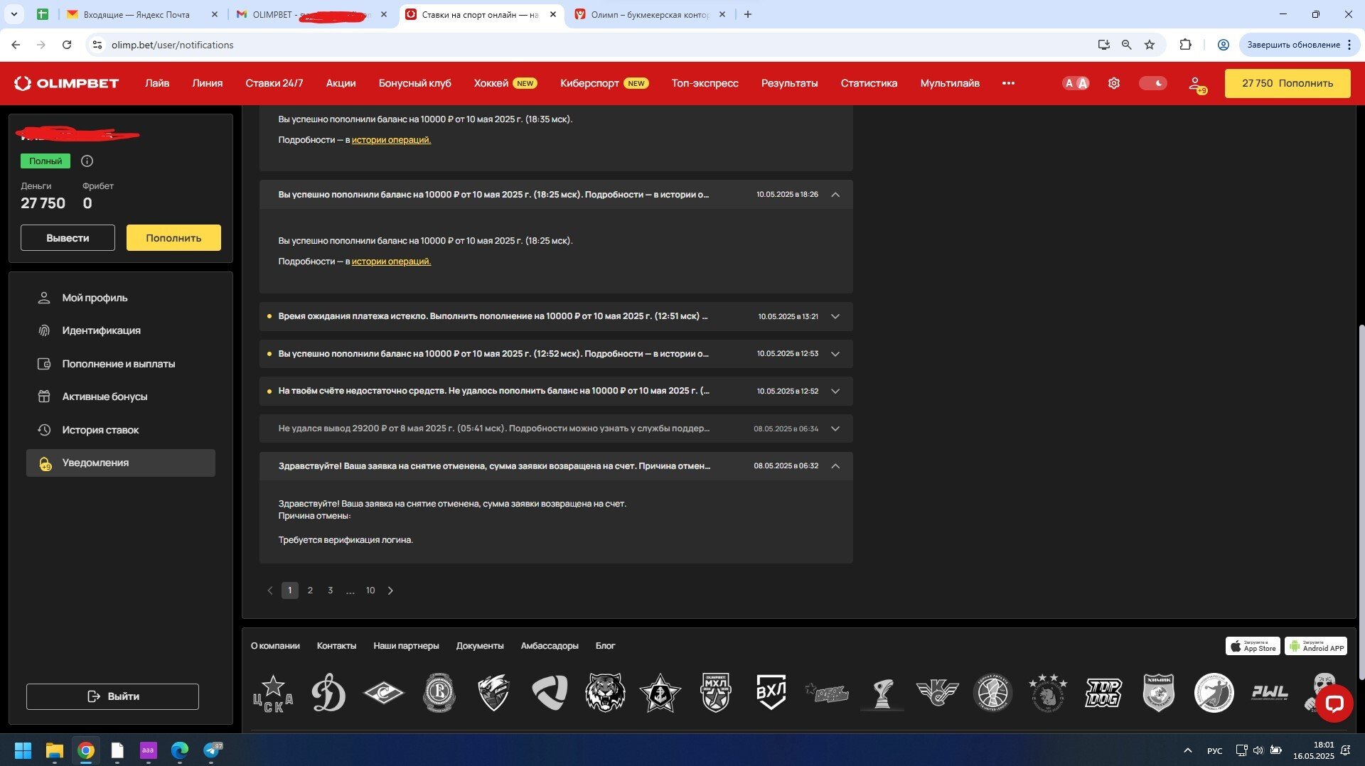 Здравствуйте! Контора занимается полным беспределом. Как оказывается у меня запросили верификацию логина 8 мая, то есть выводы мне запретили(о чём я узнал только сегодня), но пополнять я мог, то есть проигрывать. Это как так получается ? Делай депозиты, играй но выводи мы тебе запрещаем. Прошу вернуть все мои депозиты сделанные позднее 8 мая на сумму 50 000 рублей. на данный момент идёт верификация аккаунта(опять же непонятно почему) и будет он длиться до 20 мая. Ужасная и подлая в плане правил контора
