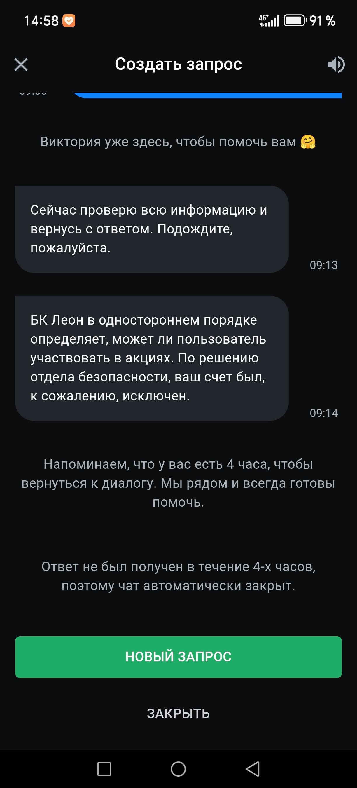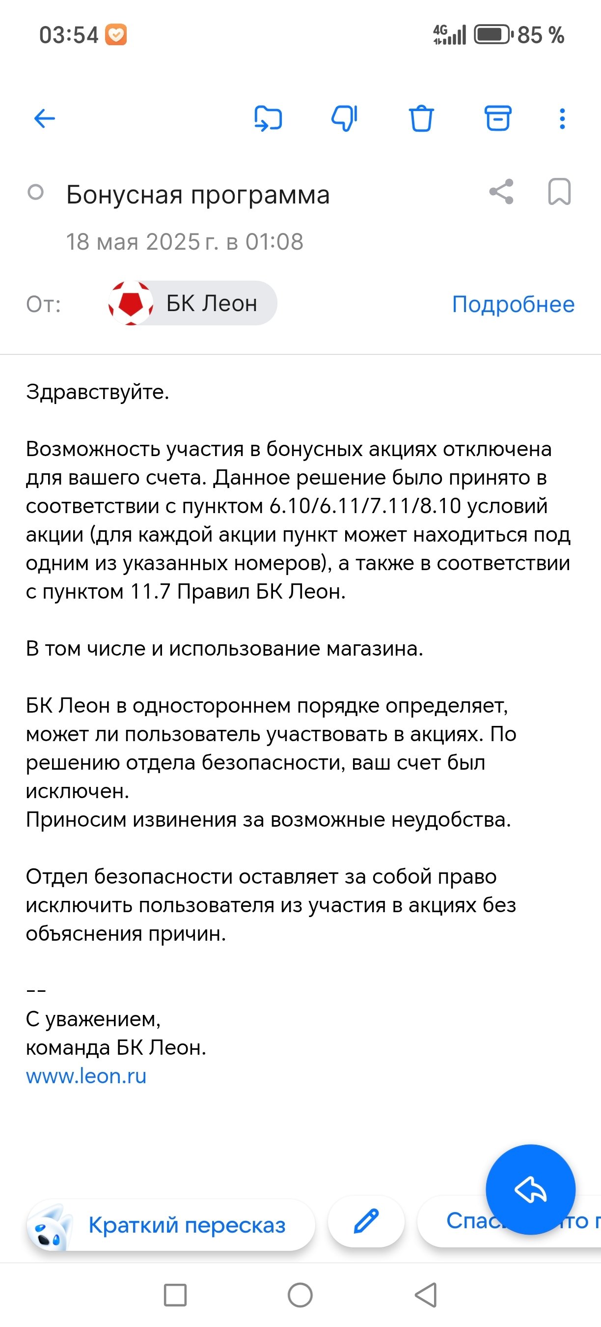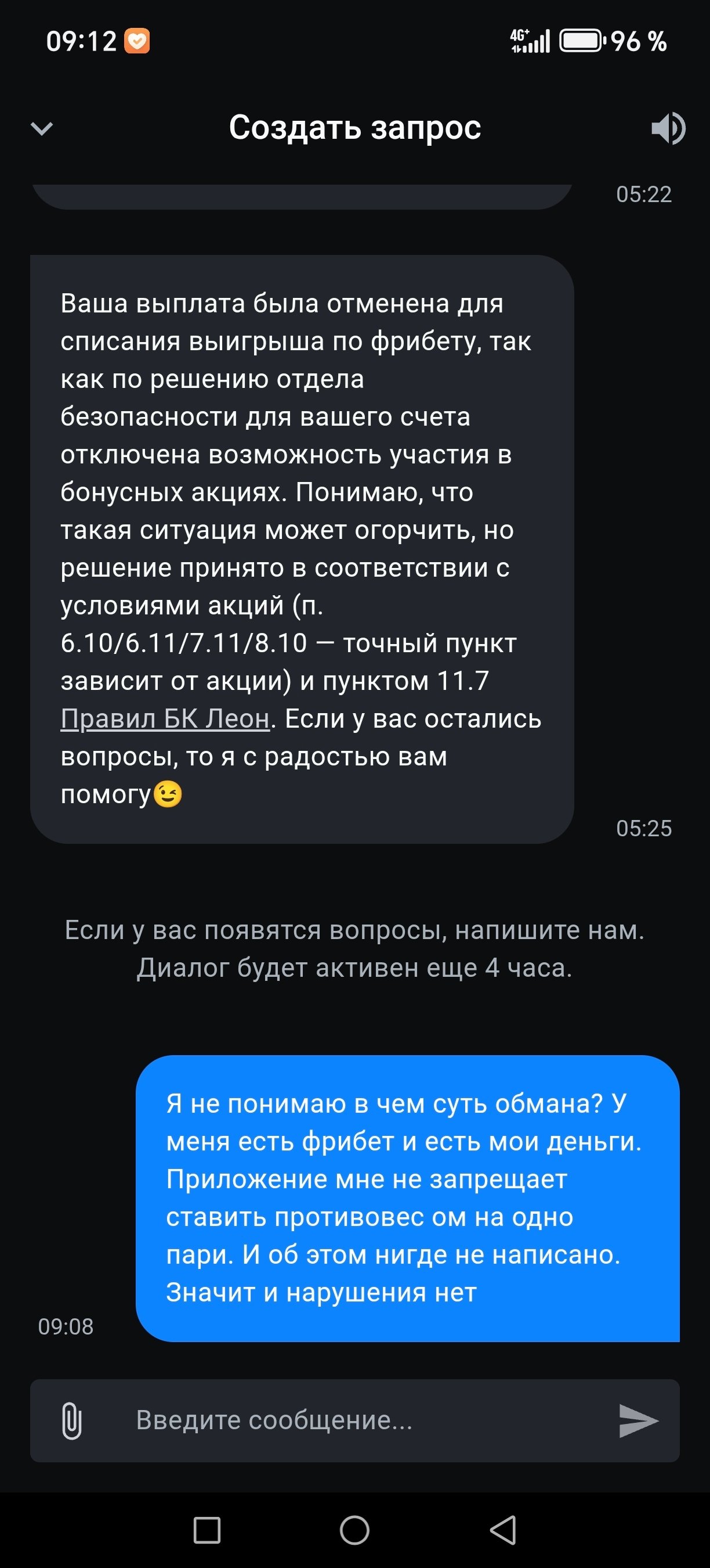 Я, Фёдор Белян, зарегистрирован в БК Леон с 17мая 2025г. А так же 17 мая я сделал две ставки: 1. На собственные средства 3000 рублей на победу команды Теннис - wta- Рим Кори Гауфф2. На фрибет (3333 рублей), полученный в рамках акции, на победу команды Теннис - wta- Рим Ясмин Паолини Ставка по фрибету выиграла, и на мой счет зачислилось 5999, 40 рублей. Когда я попытался вывести средства 5900 рублей, БК Леон заблокировал счет и прислал уведомление: > *«Возможность участия в бонусных акциях отключена... решение принято по п. условий акции и п. 11.7 Правил БК Леон»*. **Нарушения со стороны БК Леон**: 1. **Безосновательная блокировка** - Я не нарушал правила акций: - Фрибет использован на разрешенное событие (ставка на Теннис - wta- Рим Ясмин Паолини с коэффициентом ). - Мультиаккаунтинг и арбитражные стратегии исключены. - В нарушение п. 4.4 Правил БК Леон, мне не предоставили доказательств нарушений. 2. **Незаконный отказ в выводе собственных средств** - Даже если фрибет аннулирован, мои личные 5900 рублей должны быть возвращены (ст. 1102 ГК РФ о неосновательном обогащении). 3. **Игнорирование запросов** - Поддержка БК Леон отказалась дать внятные пояснения, сославшись на «решение отдела безопасности». **Требования**: - Разблокировать счет и разрешить вывод 5900 рублей (собственные средства + выигрыш). - Предоставить письменное обоснование блокировки с ссылками на конкретные нарушения. **Приложения**: 1. Скриншот ставок (фрибет + собственная ставка). 2. Переписка с поддержкой БК Леон. 3. Уведомление о блокировке счета. **Прошу Legalbet**: - Запросить официальный комментарий у представителей БК Леон. - Помочь в разрешении спора и возврате средств. В случае отказа оставляю за собой право обратиться в ЦУПИС, Роскомнадзор и суд
