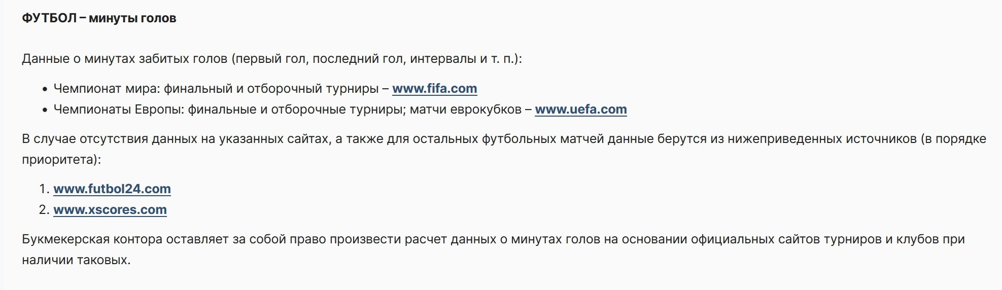 согласно п.2 правил расчета рынков голов « Букмекерская контора оставляет за собой право произвести расчет данных о минутах голов на основании официальных сайтов турниров и клубов при наличии таковых.»