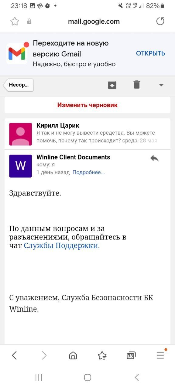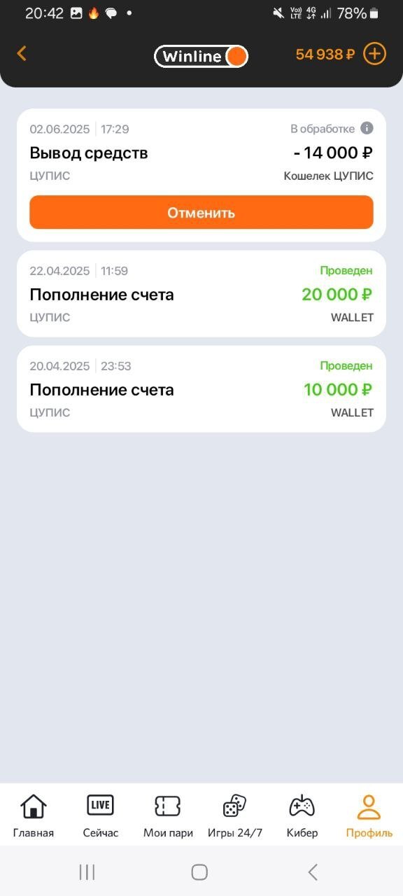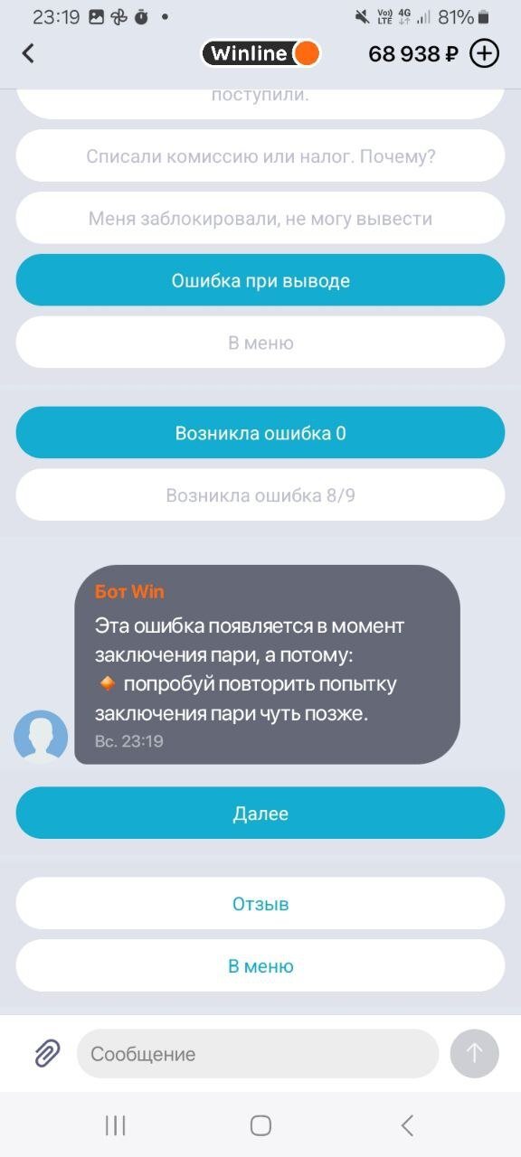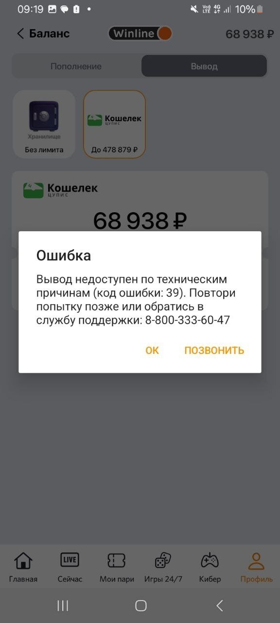 Уважаемый LegalBet, повлияйте на Winline. Сколько можно уже издеваться. Написал письмо на почту им в ответ они послали меня на чат в приложении а в чате только бот, оператора нет. Подсветили ЦУПИС для вывода вместо того как ранее было у меня только на реквизиты. Что еще нужно от меня Вывод не дают на цупис постоянно ошибка ниже скрин.