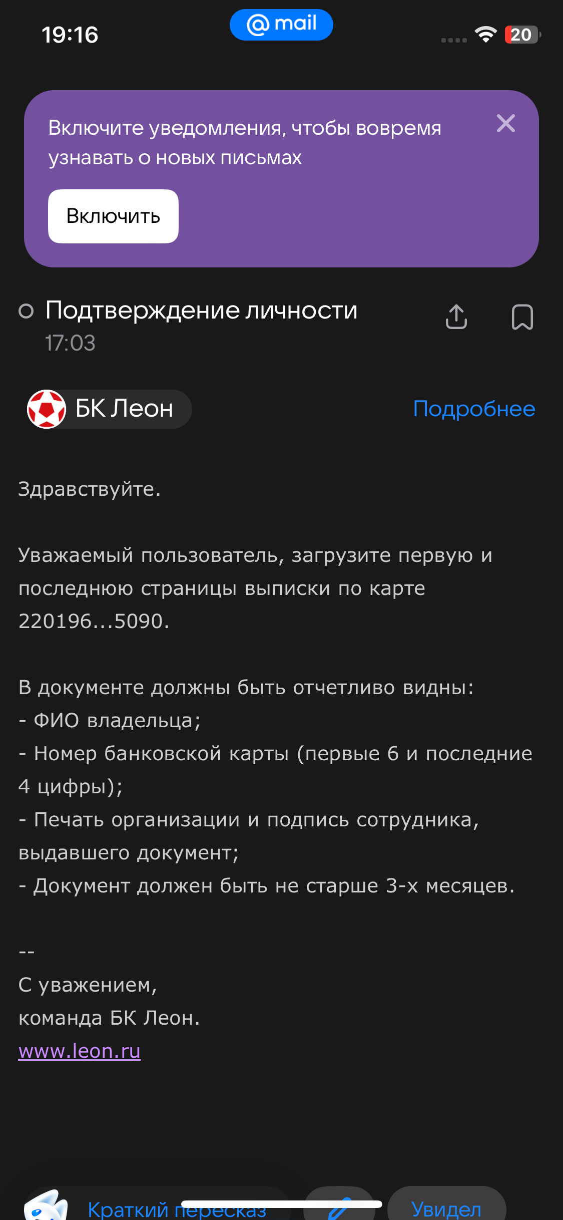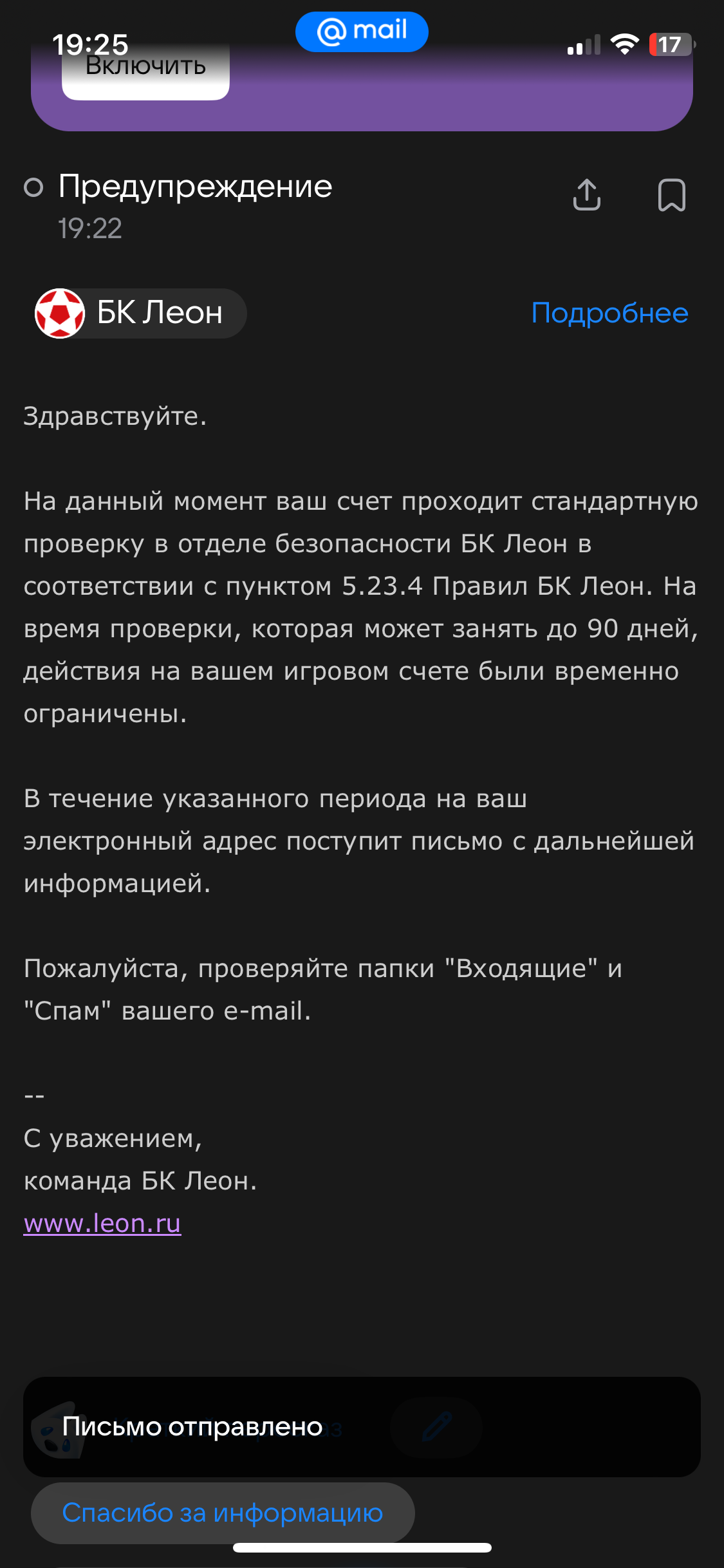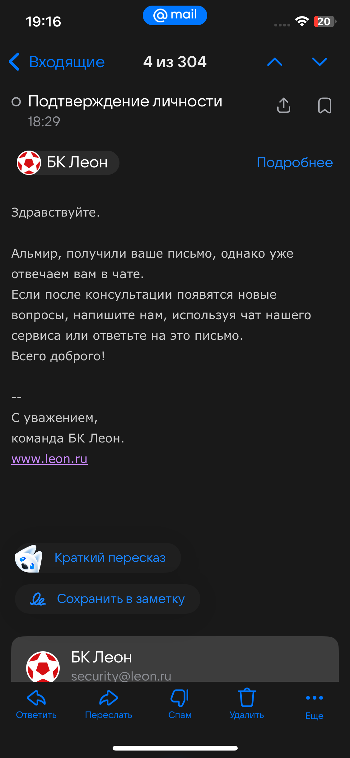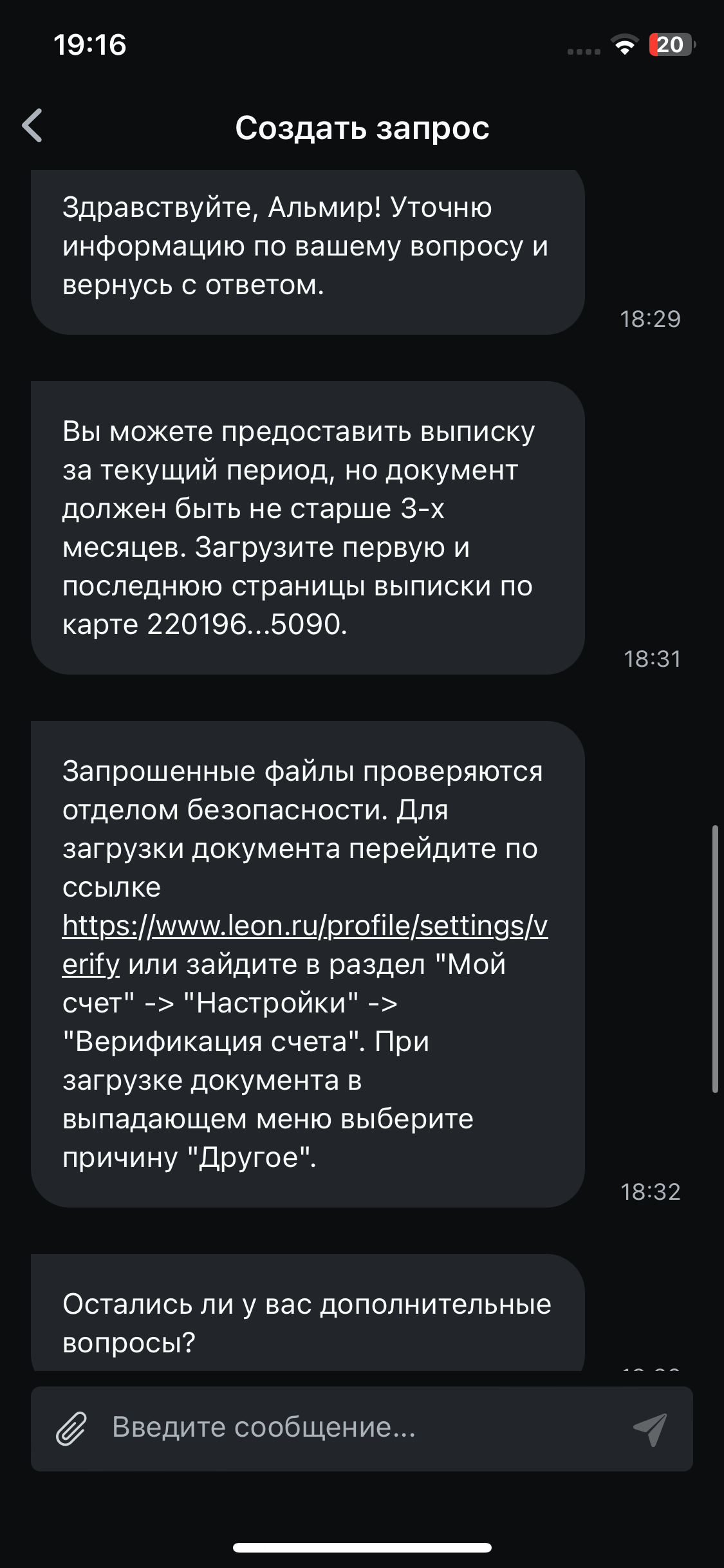 В общем и целом, я выиграл 17 мая 2025 года 27000 рублей в БК Леон, начал их выводить, но мне прилетела верификация. Суть в том, что в ЦУПИСе я 3 месяца назад обновил свой паспорт потому что исполнилось 20 лет. Я поднял уровень до «продвинутый», привязал карту свою к ЦУПИСу и также скидывал выписку с банка. Отсюда вопрос, если все БК работают с ЦУПИСом то зачем снова верификация и такая же процедура?В общем я написал в поддержку Леона, мне сказали скинуть им мой паспорт, я скинул. Потом потребовали фото банковской карты, я скинул. И еще сказали отправить им оригинал выписки по банковской карте, и пояснили «если по каким то причинам не удается получить выписку, то предоставьте документ, который подойдет под условия». У меня нет свободного времени чтобы доехать до отделения банка ОТП, он за 150 км от меня и я не собираюсь тратить свое время. Я написал в поддержку банка, попросил документ, который мне был нужен, там должно быть указано ФИО, печать банка, номер банковской карты (первые 6 цифр и последние 4 цифры). Я этот документ получил и отправил на почту Леона.Они мне так и не сняли ограничения на вывод средств. На что я получил ответ, где они уже переобулись и сказали, что они требуют фото оригинальной выписки карты, закажите курьера.Хорошо, я написал в банк, попросил вызвать мне курьера, но они такую услугу не предоставляют. Какой просто бред, БК Леон творит какую то ***** .Прошу помочь мне с данной проблемой