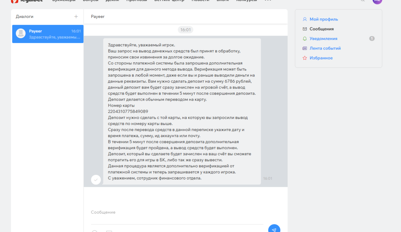 Со стороны платежной системы была запрошена дополнительная верификация для данного метода вывода. Верификация может быть запрошена в любой момент, даже если вы и раньше выводили деньги на данные реквизиты. Вам нужно сделать депозит на сумму 6786 рублей, данный депозит вам будет сразу зачислен на игровой счёт, а вывод средств будет выполнен в течении 5 минут после совершения депозита.