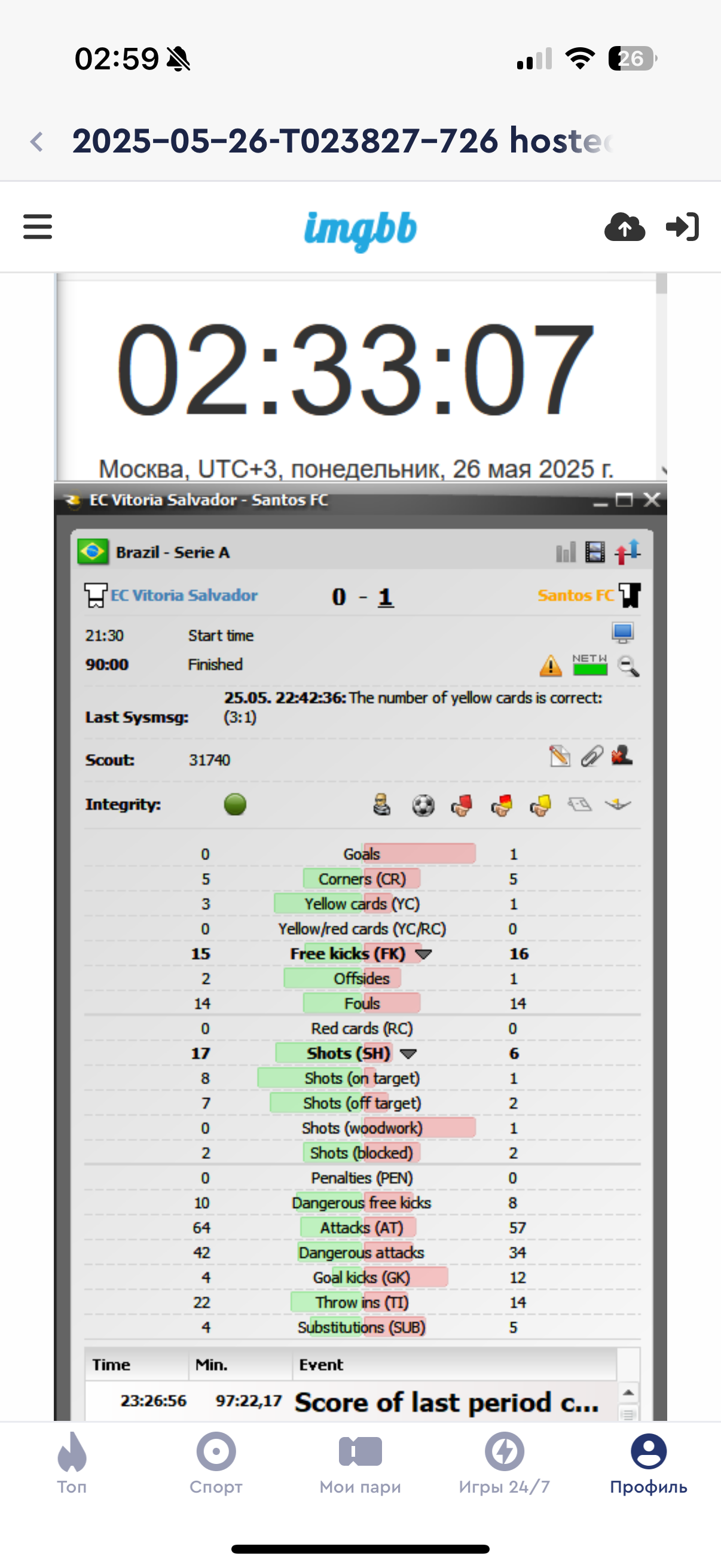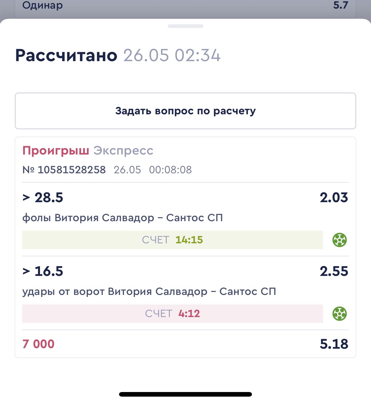 Здравствуйте не правильно рассчитали удары От ворот в моей ставке в экспрессе Я поставил что ударов От ворот будет 17 В трансляции их было 18 Фон бет присылает какой-то непонятный скрин с 16Софа скоре показывает 17 У меня в экспрессе стоит тотал фолов 28.5В их скрине количество фолов 28 но его рассчитывают как выйграш Скрин прилагаю В во время которое сделали скрин матч еще не был завершен