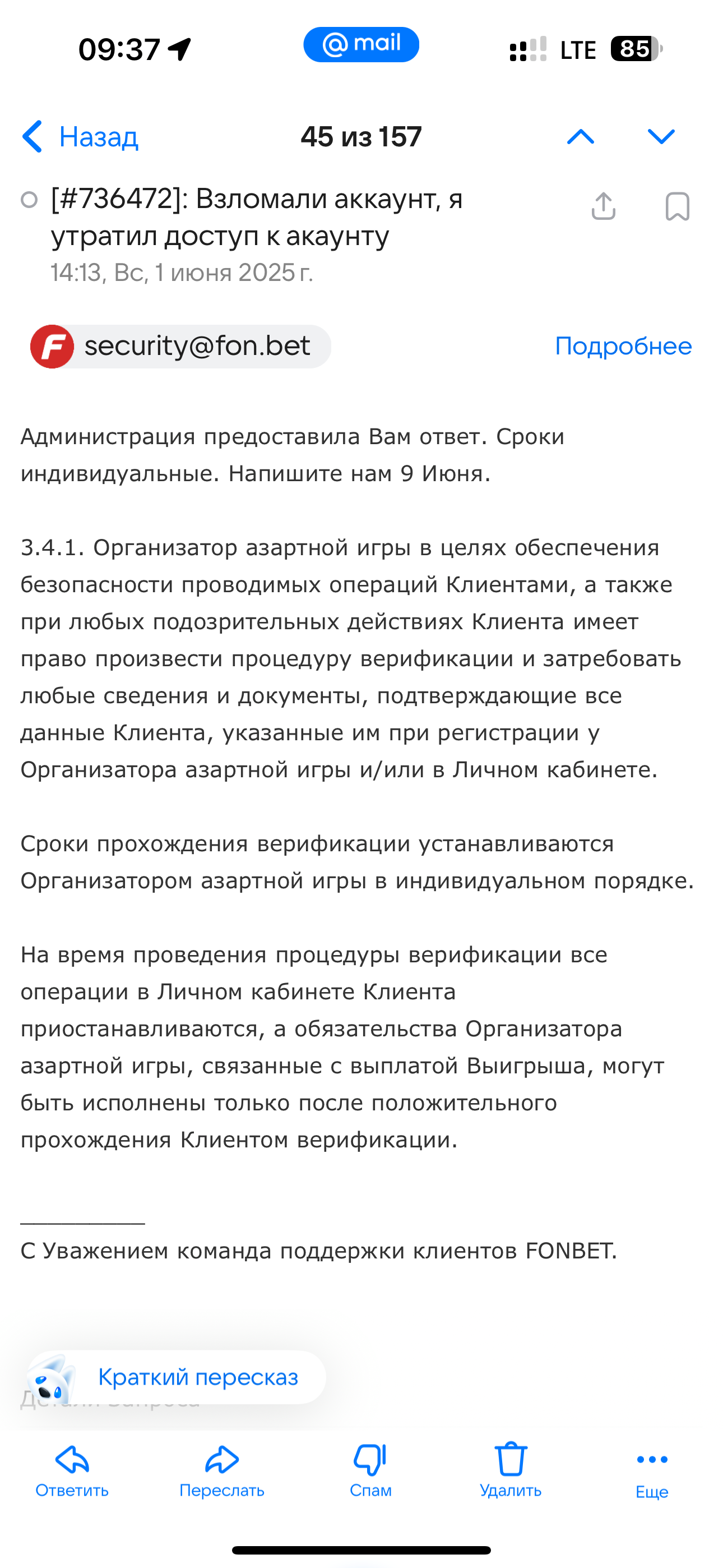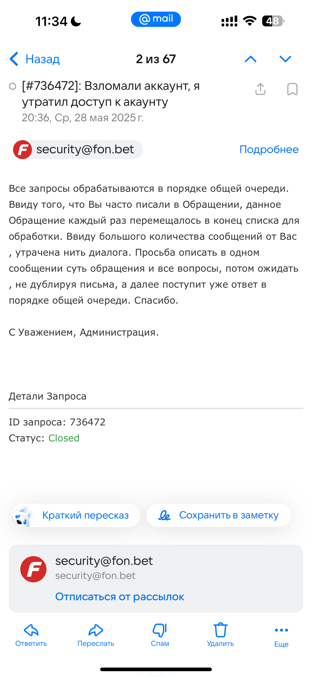 Мой акаунт украли из моего личного доступа, а именно сменили логин и пароль, после обращения в службу поддержки меня направили к администрации, связь обязательна по почте , я связался с ними по почте, изначально администрация вела диалог с мошенниками не подпуская меня к диалогу, принимая поддельные документы мошенников, выдавая их за мои, так же компания не давала мне создать запрос так как был уже созданный запрос мошенниками, с неизвестной мне почты, я обратился к администрации в 20:13 по МСК, с просьбой восстановить мои логин и пароль, на что был проигнорирован, далее ребята из администрации народного букмнкера как они заявляют, написали мне письмо, о том, что я продал свой акаунт, на что я ответил, я ничего не продавал, далее ребята из администрации народного букмекера уверили меня в том, что я дал расписку о продаже своего акаунта, и уверили меня, что на фоне расписки лежит мой паспорт, на что я опять ответил им , что расписки не давал, паспорт им свой скинул, для сравнения с паспортом который лежит на расписке, как я понял, данные там рознятся, далее эти же ребята из администрации народного букмекера, запросили у меня очередные фотографии с паспортом в руках, с датой на листе , на что я ответил им нужной фотографией, далее администрация ушла в тишину, никакого ответа ничего. Потом выясняется, что они оставили мой акаунт в руках мошенника, и продолжают переписку с ним, узнал я это просто, позвонив по горячей линии народного букмекера - Фонбет, указав свой айди и свои паспортные данные, после чего написал снова администрации по почте, что вы ведете диалог с мошенниками, самое смешное, что цупис мой как и все остальные акаунты на других бк были взломаны, и доступ я получил к своим взломанным акаунтам в тот же день, как обратился, подтвердив свои паспортные данные и предоставив фото с лицом паспорта, но наш народный букмекер- фонбет, где я кстати являюсь вип пользотвателем GOLD, почти самый максимальный статус, решили продолжить меня игнорировать, после чего я в 8 часов вечера администрация запросила снова у меня информацию с моим паспортом и лицом и нынешней датой, соответсвенно я отправил данные, я ведь хочу получить доступ к акаунту, но на что опять получил игнор, и отсуствие ответа, после со мной связались , снова спросив очередной и тот же вопрос, о наличи расписки, на который я снова дал ответ, расписка не моя подпись не моя, нотариусом не заверено, паспорт мой всегда был при мне, на что букмекер снова ушел в тишину. Ответа они мне по сей день так и не предоставили, доступа к акаунту не дали, деньги оттуда забрать не дают, я хочу добиться понижения рейтинга работы администрации данной организации, а именно Фонбет. Далее хочу вернуть свои деньги, далее хочу извинений от данной компании, самое смешное, что они реально по сей день, ведут переписку с мошенником, полностью убежденные, что ведут переписку со мной. Не знаю как повлиять на них, ведь в администрации они замалчиваются, в поддержке ответов не дают, как действовать ? Да и время уже прошло 8 суток с момента подачи обращения официального, это еще сколько они мне не отвечали, как быть ?