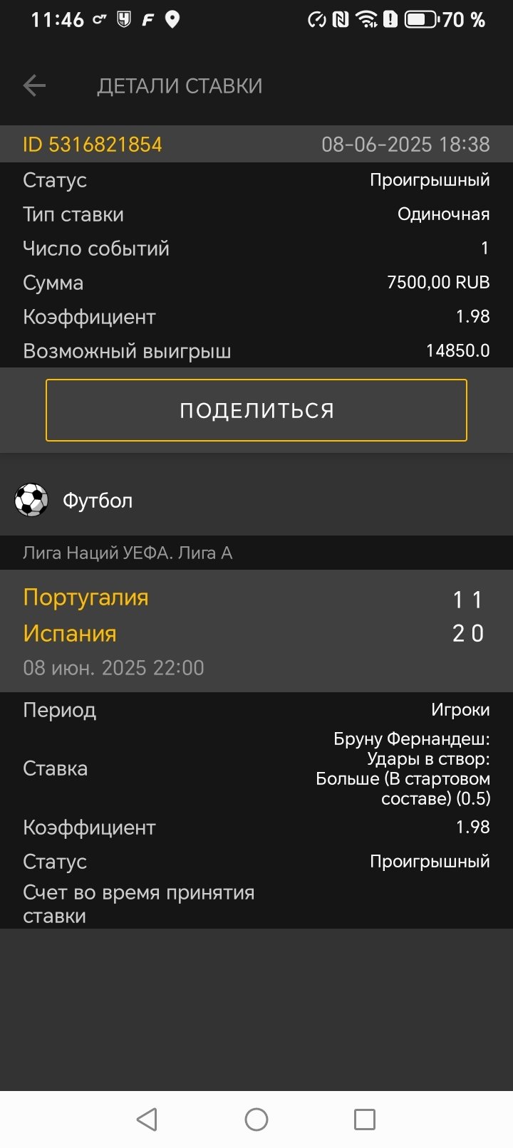Добрый день)вчера была сделанна ставка на матч Португалия Испания а конкретно на тотал игрока Бруно Фернандеш по ударом в створ ворот больше 0.5 удар был нанесен на 92 й минуте добавленного арбитром ко второму тайму времени,со штрафного удара)Рассчитали ставку как проигрышную,помогите пожалуйста разобраться в этой ситуации)Заранее вам признателен)