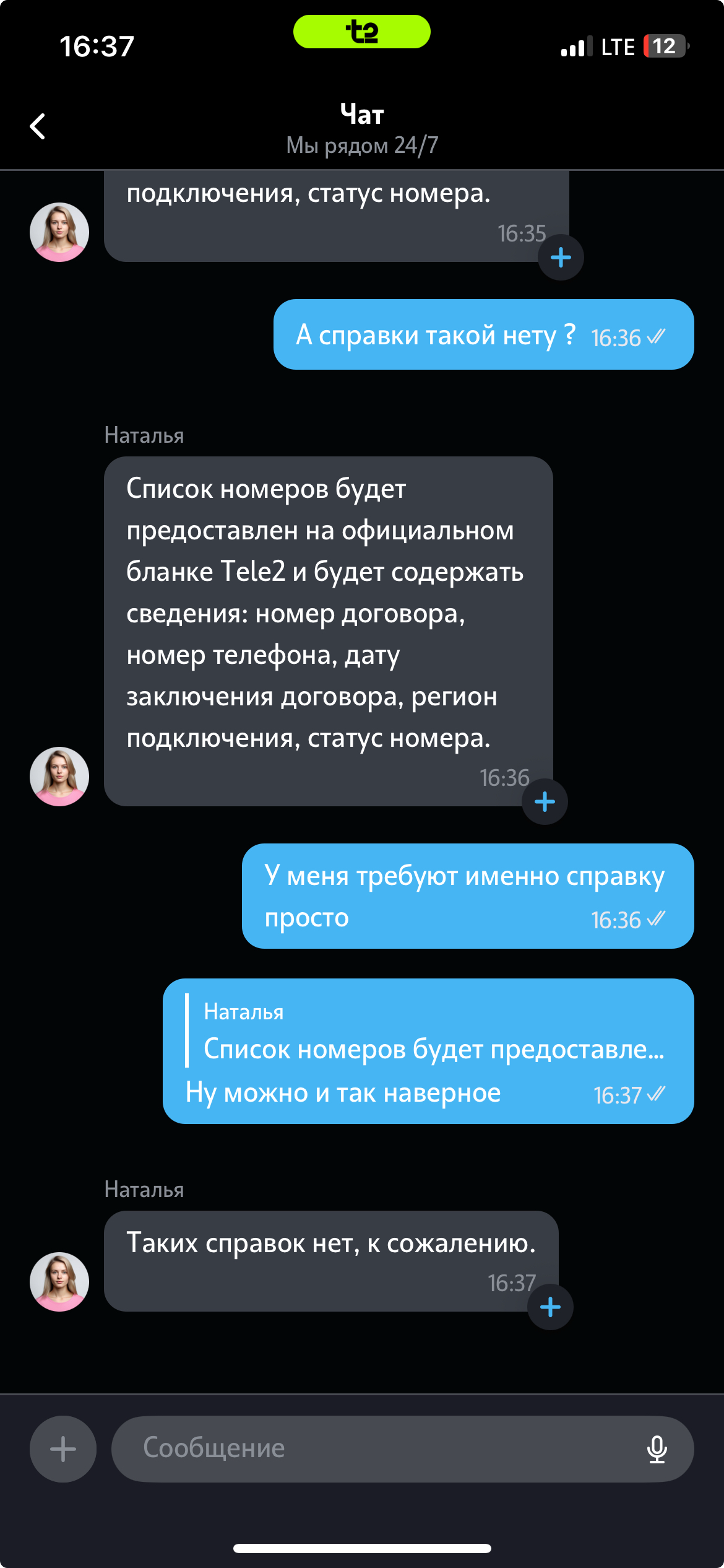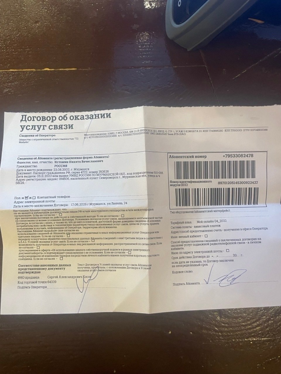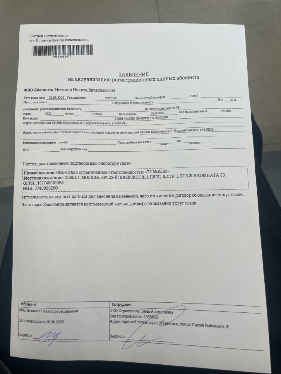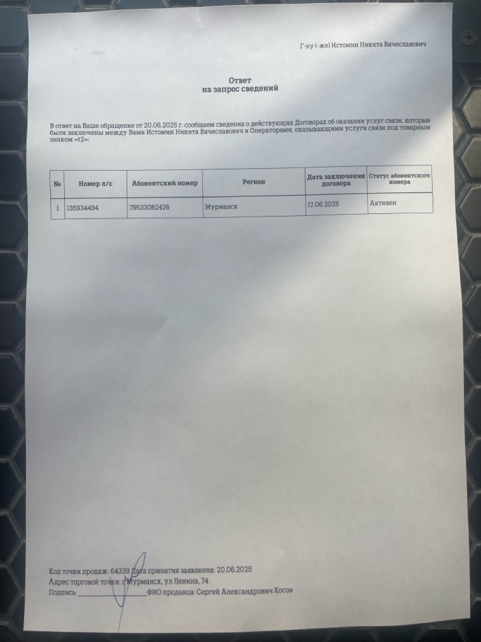 Я по поводу проверки данных, вот смотрите, я ходил в салон связи, изначально договор и номер был заключен на мою мать, так как номер был сделан, когда мне было лет 10, вчера я с матерью пошел в салон связи, был перезаключили договор на меня. После чего договор дали мне на руки. Я его и сфотографировал и отправил вам. Они печать не ставят ни на договор, ни на справки. Оператор у меня теле2. Вот как решить эту проблему