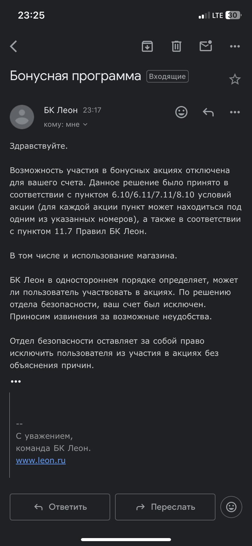 Бк «ЛЕОН» предложили акцию 1000 руб пополни и получи 3333 фрибета, в итоге я у них выйграла и сразу же на почту пришло что «мы имеем право отказать без причин». Это честный букмекер?