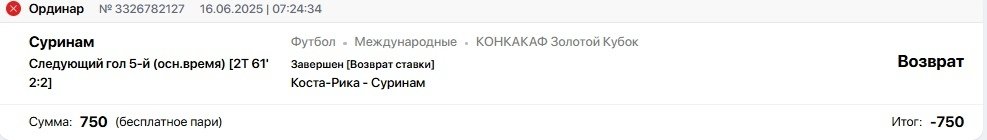 Сама ситуация выглядит чуть забавно, так как речь идет о расчете фрибета, но ее суть так-то имеет фундаментальное значение для понимания "а стоит ли вообще иметь дело с Винлайн" В матче Gold Cup Коста-Рика - Суринам после того как счет на 59-й минуте стал 2:2, я на 61-й поставил следующий гол Суринам за Что видно по хайлайтам матча ( В самом начале 62-й минуты защитник сблокировал мяч рукой, судья пошел смотреть ВАР, поставил пенальти, который Суринам реализовал Мне рассчитывают с кэфом 1. То есть их же фрибет сгорел. Служба поддержки как всегда морозиться, мол, технический сбой. Кэфы были не те Аргумент "а с хрена ли они не те, когда на явного аутсайдера (Суринам) котировка "следующий гол" при ничейном счете на 60-й минуте всегда будет примерно такой". Здесь нет никакой аномалии - кэф не стал 100 или даже 10. И здесь возникает вопрос "Чем руководствовалась контора" по-настоящему? Свои правила они пусть оставят себе, и так понятно, что они против игроков. Что важно понять: они считают, что я смотрел матч и пытаюсь их обмануть, нажав ставку раньше, чем они среагировали на потенциальный ВАР? Так у меня были свои деньги на счету. Зачем мне ставить мелкий 750-рублевый фрибет? Плюс в этих делах, когда люди пытаются наживать на разницы в секунды между событием и реакцией конторы, никогда замечен не был Плюс у меня четко написано в квитанции, что ставка была на 61-й минуте Потому что никакого сбоя в кэфах не было - кэф был обычный, поставил я (матч не смотрел), но, видимо, за мгновения до этого Вара Поэтому их ссылки на сбой - полный бред. И в очередной раз получается, что они действуют в свою пользу в той ситуации, когда имеют шанс хоть рубль себе отгрызть чтоли?