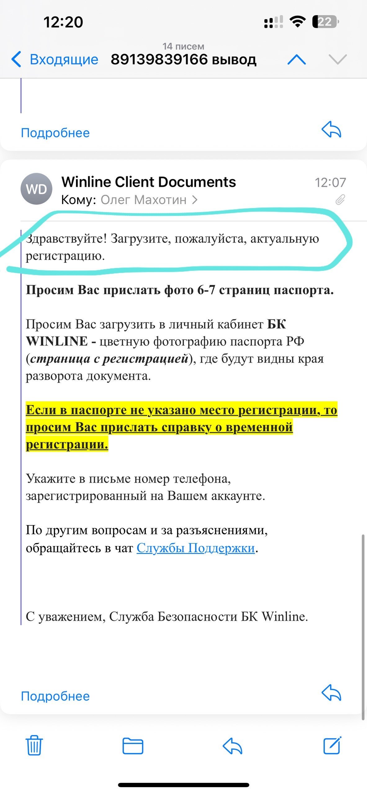 Зарегистрирован ещё с 2017 года, играл спокойно, выводил вводил. Далее немного начал выигрывать позвонили сначало по видео в телеграмм, показать паспорт и банк карту, успешно прошел видео верификацию, разблокировали спокойно вывел, опять завел через время потребовали фото банк карты у меня цифры стерты были отправил файл с банка прошло, опять все нормально давали выводить и заводить. Вчера , я даже не выводил а пополнил счет на 9155р. Поставил на кэф выиграл и даже без вывода вылезла табличка опять запрос документов, сначало предоставил фото банк карты,* 2620 то есть другой, Сбербанк, с неё пополнял, далее запросили фото бумажного договора где карта и ФИО, пошел в банк взял бумагу отправил, теперь просят фото регистрации в паспорте отправил фото не принимают!! Просят бумагу о временной прописки какое отношение это имеет к бук конторе, запись на получение ближайшая 25 июня, фото прописки не принимают. В общем уже делают все что бы средства были проиграны и не виведены . Номер счета 5307814, то есть бк обязывает прописаться а если сейчас у человека нет данной возможности??