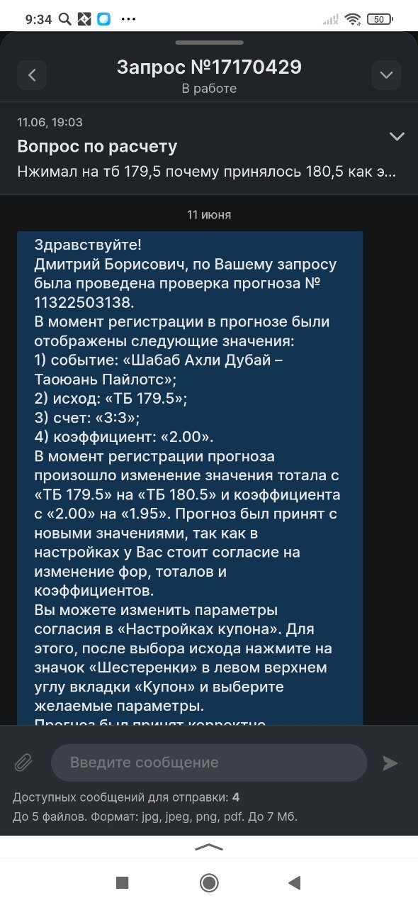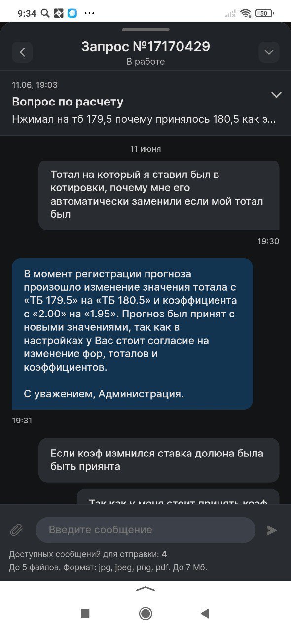 Ставил на Тотал меньше 180.5 как оказалось мне автоматически изменили ставку на Тотал 179.5 из за того что у меня стоит принятие изменений , но я возразил что в момент принятия ставки моя котировка была просто коэффициентом меньше и почему они заменили мой Тотал если он был в линии , ведь у меня стоит согласие с коэффициентом, но почему то вместо этого мне автоматически изменили Тотал , я считаю это не правомерно , я понимаю если бы моего триала не было и мне автоматически поменяли бы его ,но мой Тотал был просто коэффициент изменился