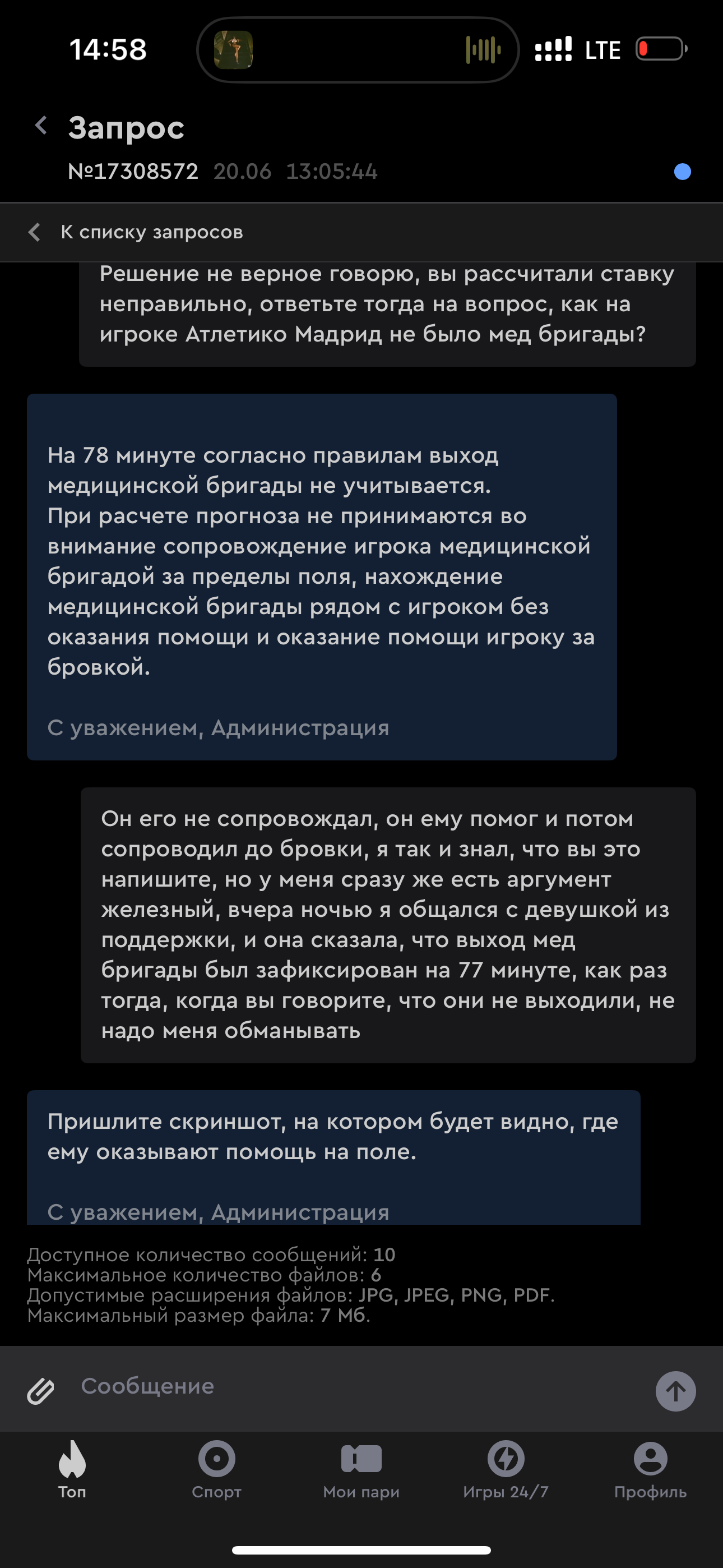 Здравствуйте, сегодня ночью играли Сиэтл и Атлетико Мадрид, брал выход мед бригады 1.5б, засчитали только 1 выход, не засчитали явный и очевидный выход к игроку на 62:45 Атлетико Мадрид. В другой букмекерской конторе засчитали. Есть видео и фото доказательства, что было 2 выхода, также скриншот с другой букмекерской конторы, где написано 1:1 по выходам мед бригады. Помогите пожалуйста, данное событие было в двух экспрессах с общим выходом
