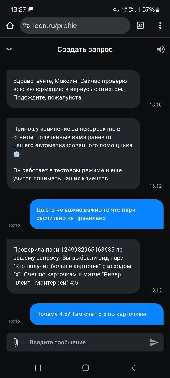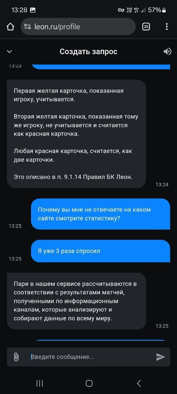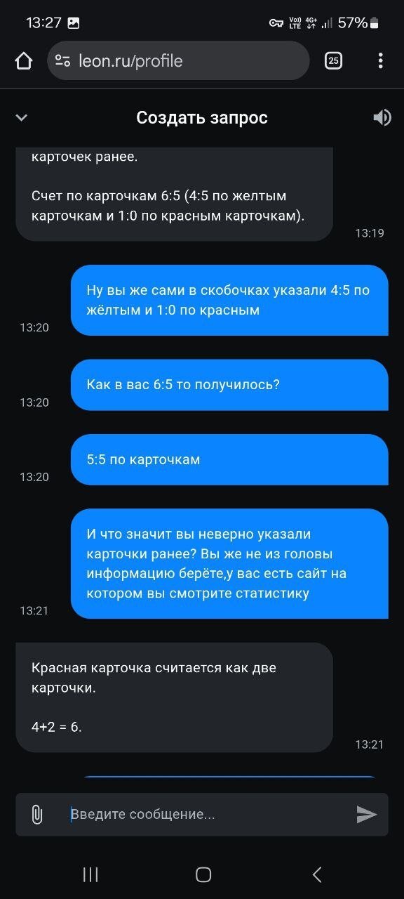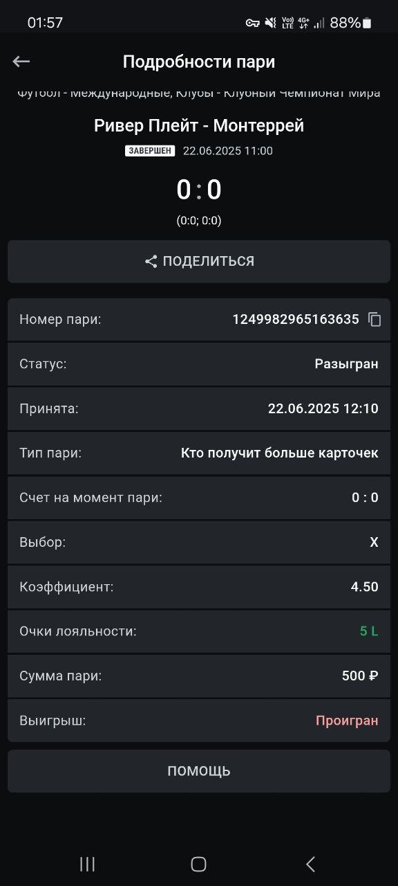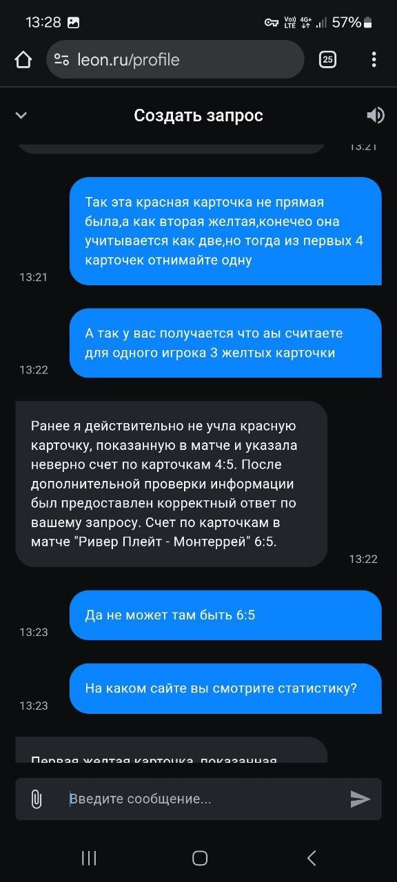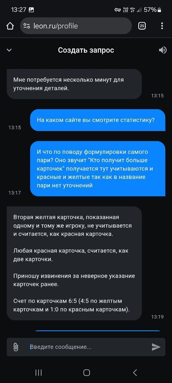 Сделал ставку в матче Ревер плейт - Монтерей на то что будет равное количество карточек, по итогу у Монтерея 5 желтых, а у Ривер плейта тоже 5 жёлтых, но 2 жёлтых было показано одному игроку,соответственно 2 жёлтая превращается в красную,итого получается у Монтерея 5 желтых, у Ривера 4 желтых и 1 красная, но букмекер говорит что считает красную как 2 жёлтых итого по их мнению счёт по карточкам 6:5 в пользу Ривера, я с этим не согласен так как пари звучало "Кто получит больше карточек", там не было уточнения именно про желтые,соответственно считать красную как 2 желтых не уместно. На вопрос с какого сайта они берут статистику они не ответили.