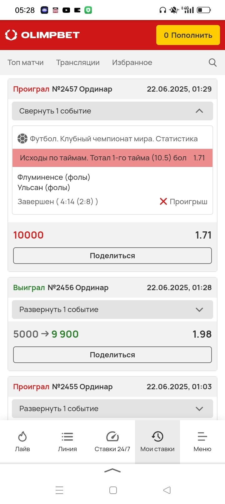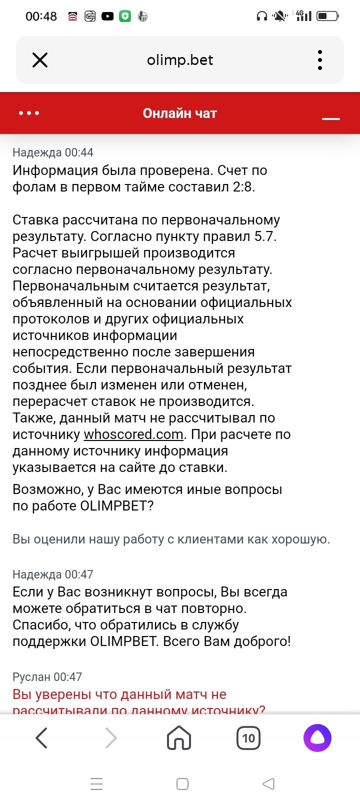 У меня вопрос по пари 2457. Данная ставка была принята некорректно, по неправильным данным. Количество фолов на момент принятия пари было не 7, а 6 что подтверждается хронологией протокола матча, взятого с официального сайта ФИФА. Расчёт фолов и прием пари на них проходил по данным этого сайта (оператор подтвердил, пруф приложу). Ставка подлежит отмене в соотвествии с п. . Ставка принята некорректно по неверным значениям тотала фолов. Раскадровку всех фолов до момента пари приложу. Там всего 6 фолов было. Причина ошибки приёма (вы один фол перепутали с оффсайдом, такое бывает). Прошу произвести отмену пари 2457 по п. . Вот ссылка на источник сайт ФИФА (раздел хронология точная, лайв блог). Фолы до момента пари 2457 в данной игре были на 6, 9, 10, 11, 24, 26 минутах. Всего до момента принятия пари 2457 было 6 фолов. Значение по фолам которые значатся в карточке приема неверные (2-5, это 7 фолов это неверные вводные данные). Соотвественно вероятности и коэфф. были все абсолютно неверные и ставка подлежит отмене.