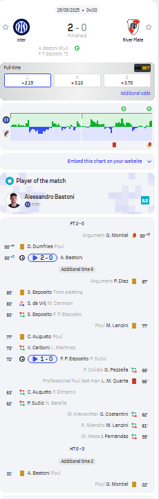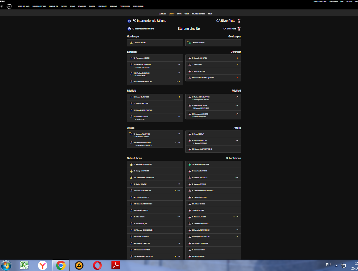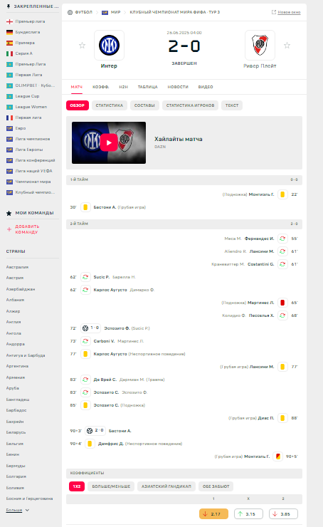 Клубный чемпионат мира. Матч Интер Милан Ривер Плейт г. Ставка по прематч линии Винлайн: 11 карточек в матче. Итог: Монтиэль 22 (жк), 95 (жк +кк), Бастони 31(жк), Мартинес Куарта 65 (кк), Аугусто 77 жк, Лансини 77 (жк), Эспосито 85 (жк), Диас 87 (жк), Думфрис 94 (жк) это так показано в протоколе на официальном сайте Фифа, а так же в Флешскор, Майскоре и много где еще, так как спорных карточек в матче не было и все показаны в основное время игрокам на поле. Пишу и звоню в службу поддержки: прошу разобраться ведь рассчитали как Проигрыш. Ответ: в матче было 12. Но на 12 я тоже ставил и там тоже Проигрыш. Ответ: мы перепроверим и как итог мне сообщают что было 9 карточек. Абсурд, как всегда запутались в своих же ответах. Прошу снова разобраться Арбитраж Легалбет (уже помогали в такой же ситуации и Помогли, Спасибо!) и Винлайн тогда признал ошибку. Тут ситуация более очевидная, для всех кроме Винлайна конечно и их службы поддержки! В комментариях прикладываю наглядные скриншоты с оф. ресурсов и известных статистических порталов. Спасибо!