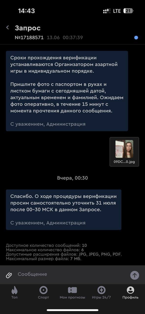 Букмекерская контора просто не хочет отдавать мои деньги. После прохождения видео верификации запрашивают фотографию и просят ожидать неделю и больше, и так по кругу. Неужели вы не можете на них как-то повлиять и прекратить это незаконное удержание моих средств.