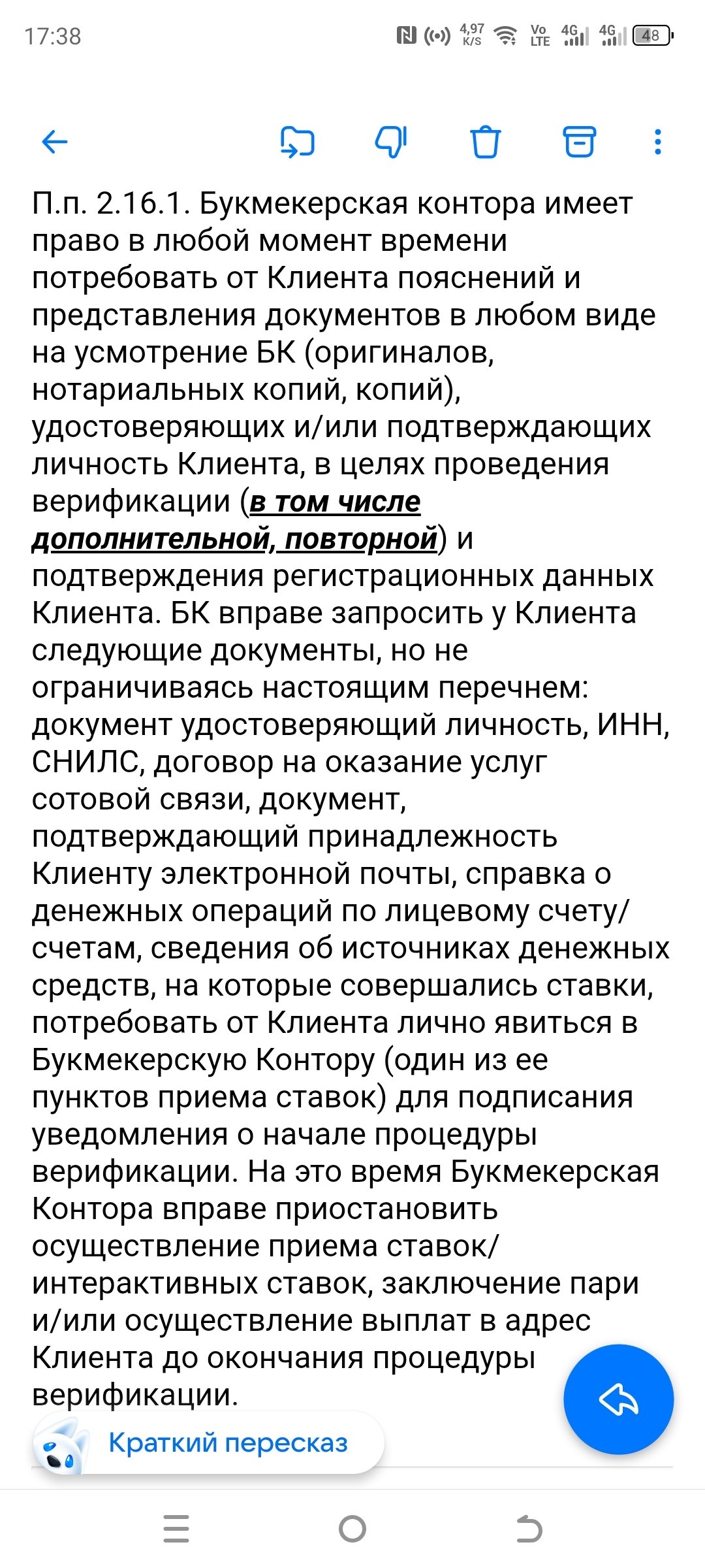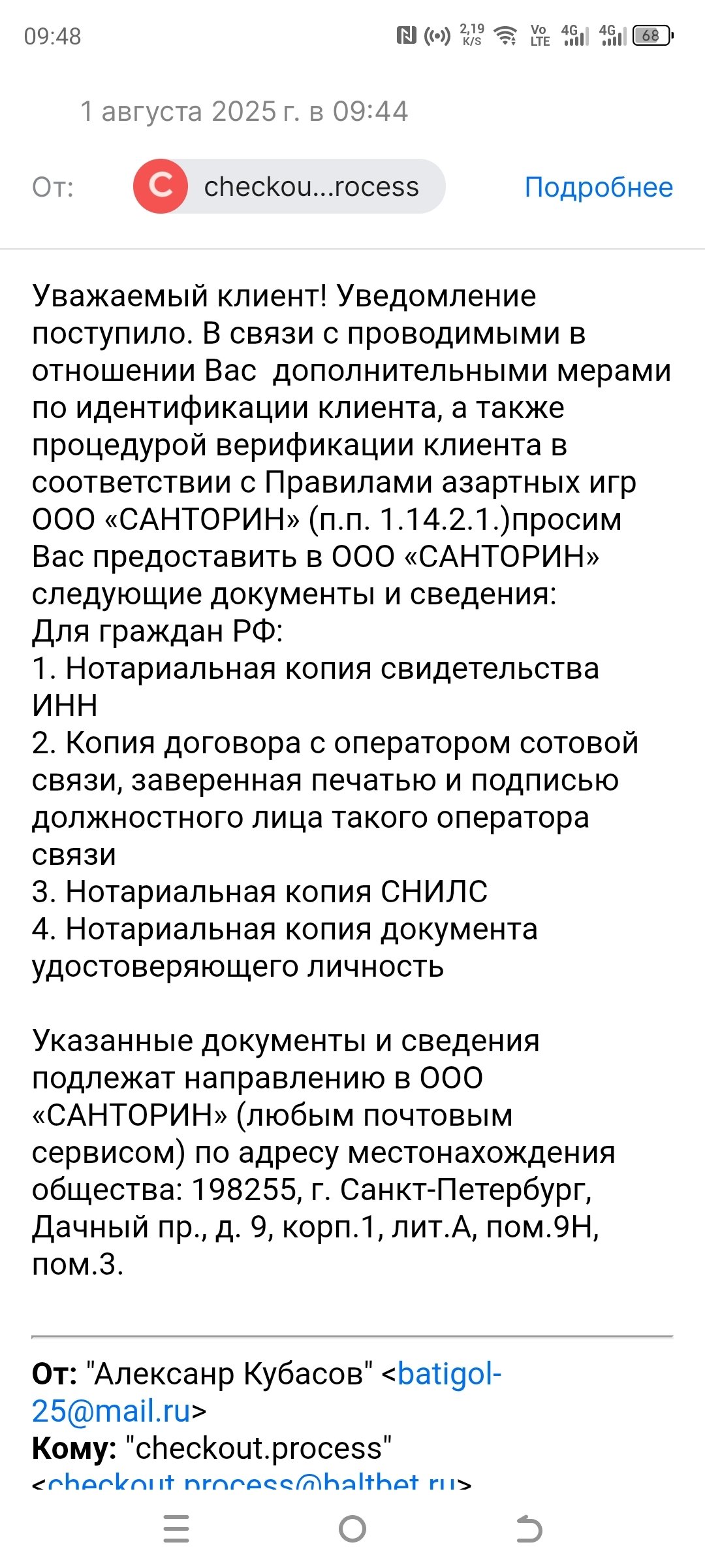 Здравствуйте. Играл довольно-таки долго в в конторе БалБет. Все просто было шикарно. Ставил во основном по 3000 тысячи, все устраивало. Снимал , пополнял, все как обычно. И 2, с утра хотел поставить ставку, но не дали. Ничего не нарушал, просто поднялся до 47000 тысяч и игра на этом закончилась. Написал в поддержку , по какой причине , не чего не сказали. Потом надо сходить в ППС , для личной верификации. Сходил девочка проверила подписала. Я спросил , что дальше она плечами пожимает. Пишутим , ответ . Теперь дождитесь оригиналов , которые придут в головной офис. Что за бред, откуда, я знаю отправит она письмо, или закинит куда нибудь. Я считаю это не законно со стороны бк, токое вытворять издеваться над игроком, который выиграл. Я прошу помочь и решить мой вопрос. Обычно видео-конференц-связь, а тут сразу так? И не ответа ни привета. С письмом бред. Така я предложил сам отправлю заказным. Только адрес напиши. Мне отказали , поэтому что я бы отправил с отслеживанием. Просьбо помочь. Вернуть мои средства.
