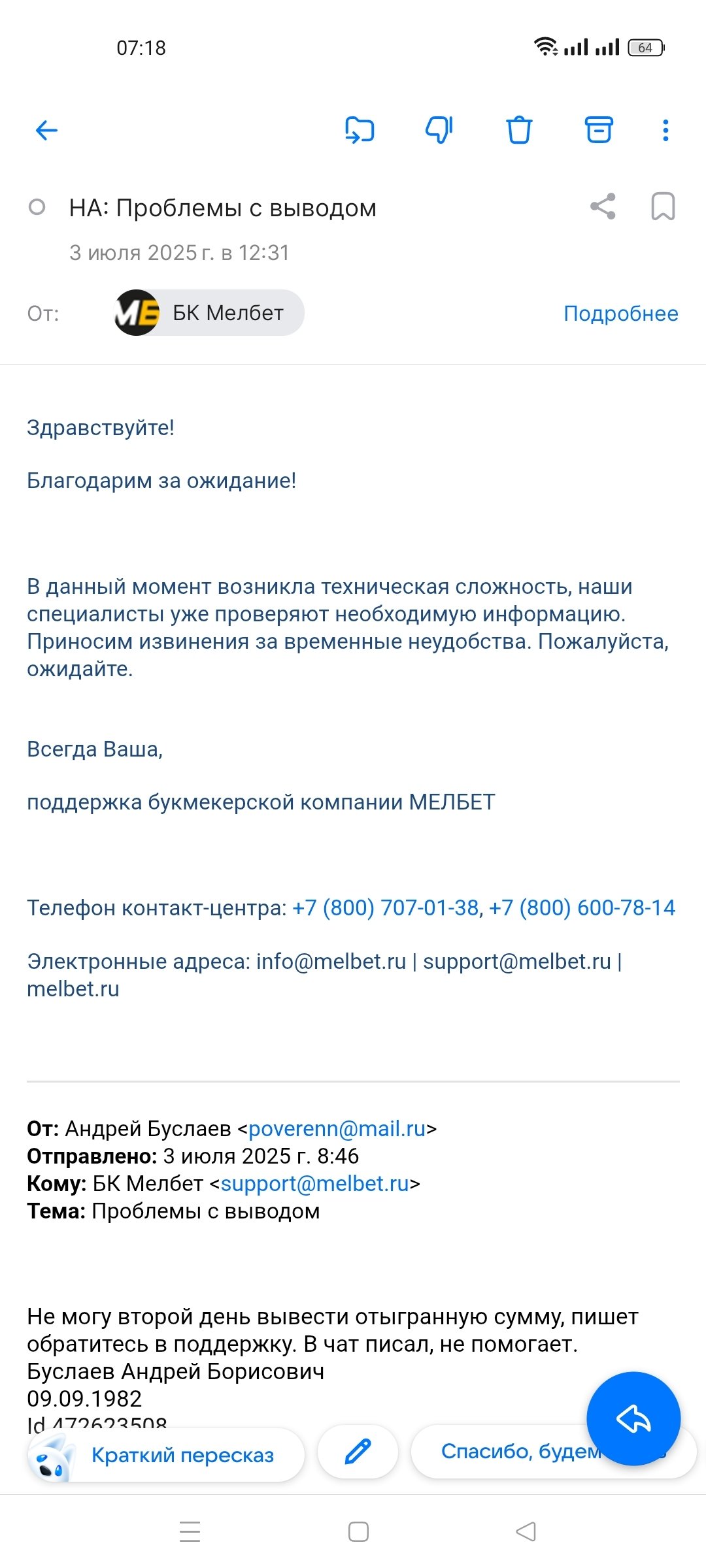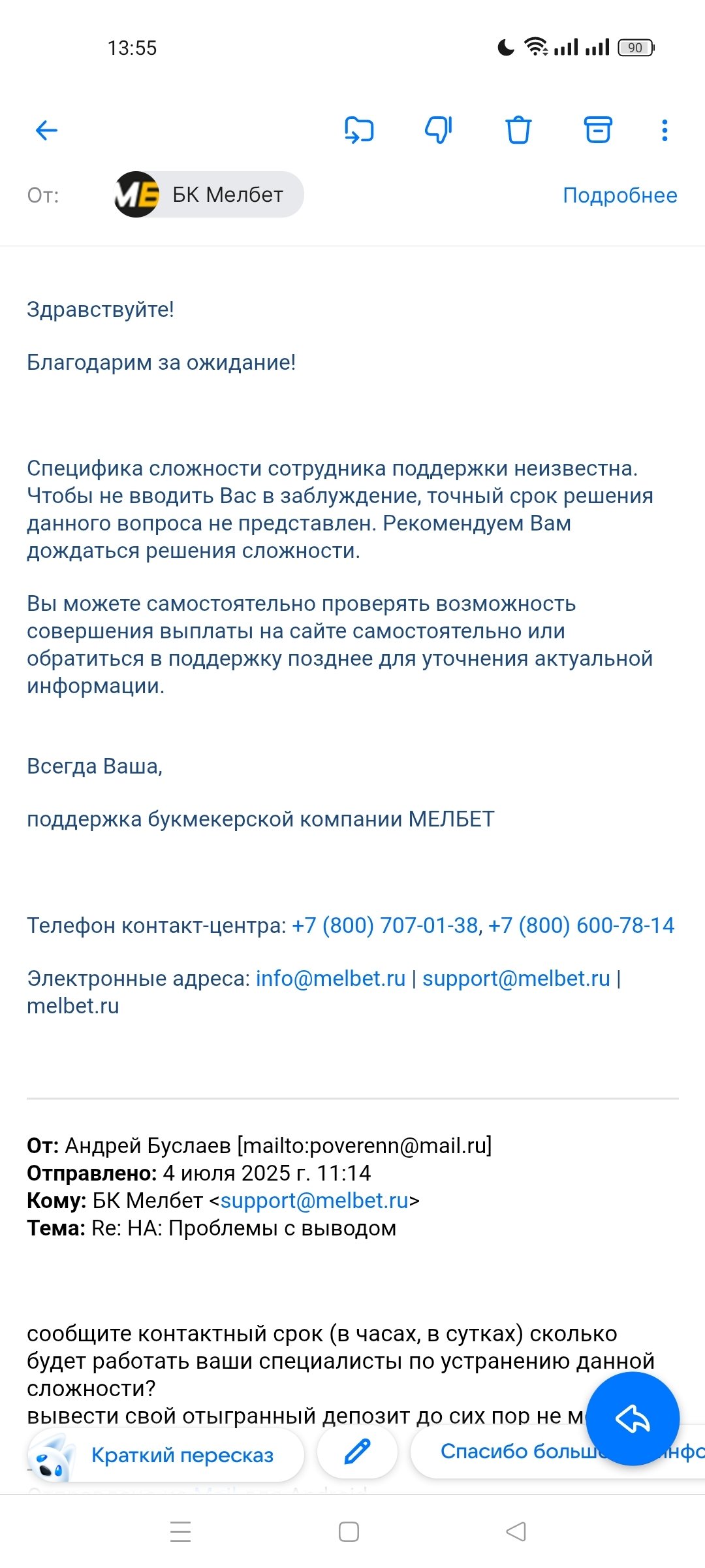 Внес 40к, отыграл их в соответствии с правилами букмекера. Третий день не могу вывести свой депозит. Букмекер говорит что у них технический сбой, специалисты разбираются. Сроки отказывают назвать.