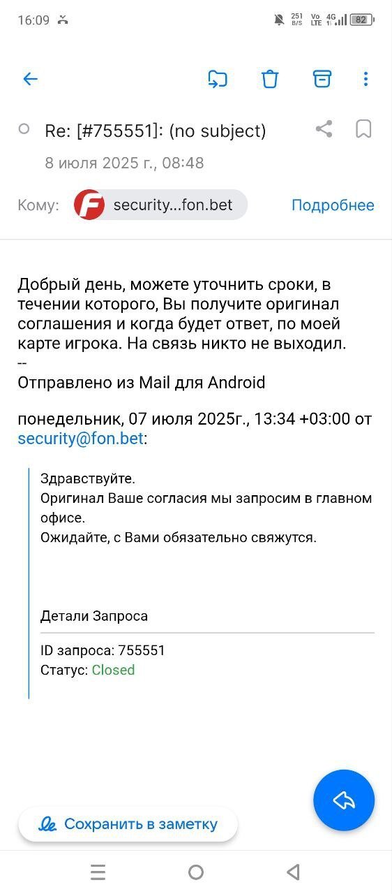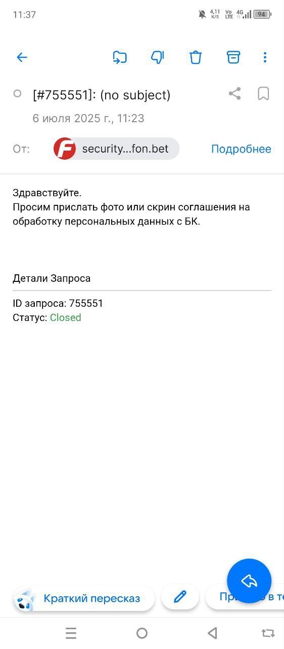 Здравствуйте, совершил 4 ставки в Г. Смоленск, на клубный чемпионат мира (по линии) на следующий день пришёл снимать часть суммы. Сказали обратиться в службу безопасности по email, связался. Попросили мое фото с паспортом, отправил. Потом попросили мое фото с клубной картой так же отправил им . Потом они попросили соглашение на обработку персональных данных. Сказали взять его в пункте приёма ставок, пришел в пункт приёма ставок на что мне сказали мы такую справку не выдаем и не знаем, после этой ситуации я отписался в службу безопасности фонбета на что мне ответили ожидайте с вами свяжутся но никто так и не связался.