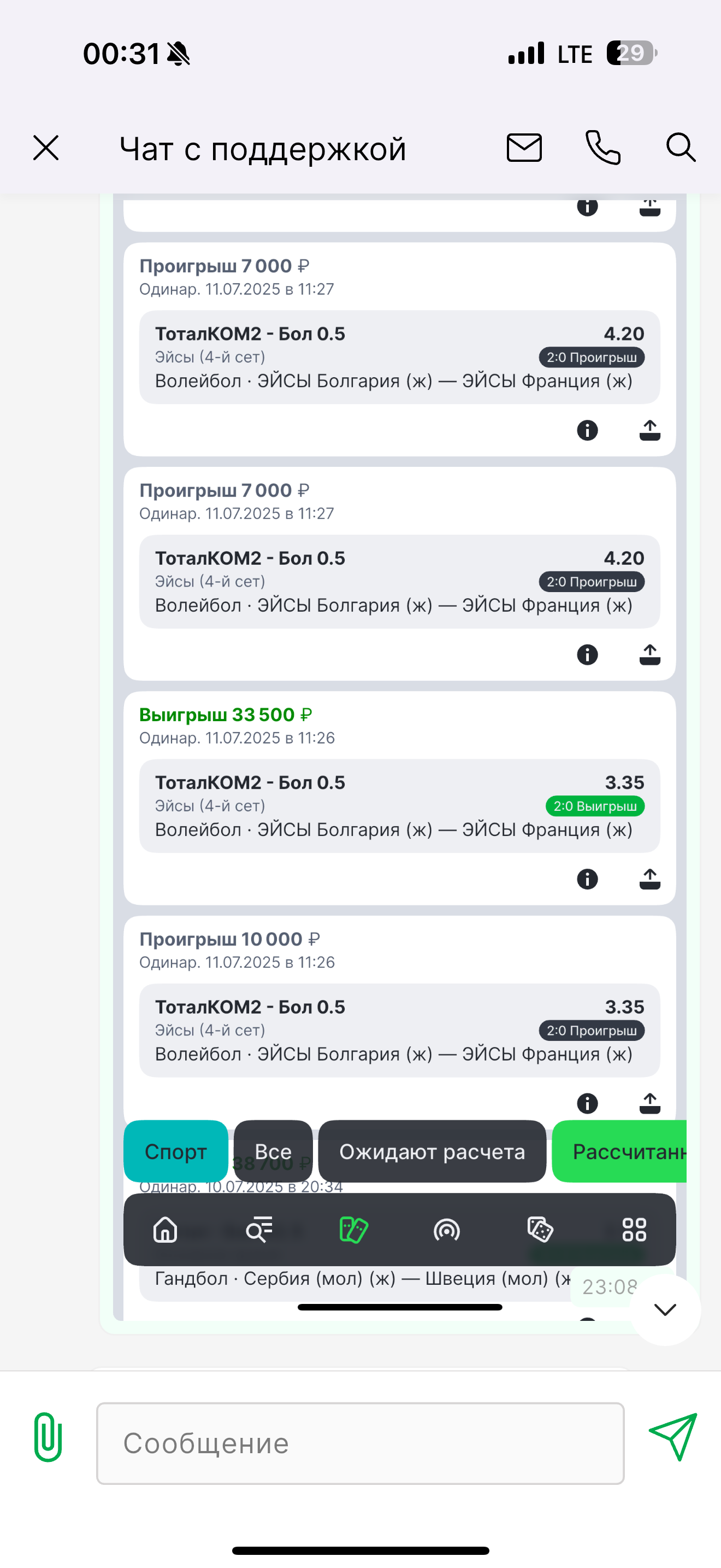 Делал ставки,на матч волейбольной лиги наций,на матч Болгария-Франция женщины 4 сет Эйсы Франции больше 0,5,Эйс Францией был подан при счете 4-4,но ставку мне рассчитали проигрышем,но согласно видео трансляции,а так же официального источника,который указан на их сайте показано,что Эйс был,они отвечают,что расчёт произведен,согласно их источника,отказываются его предоставить,как может так быть,ведь есть видео трансляция и официальный источник который у них в правилах,ниже предоставлю ссылку на источник.