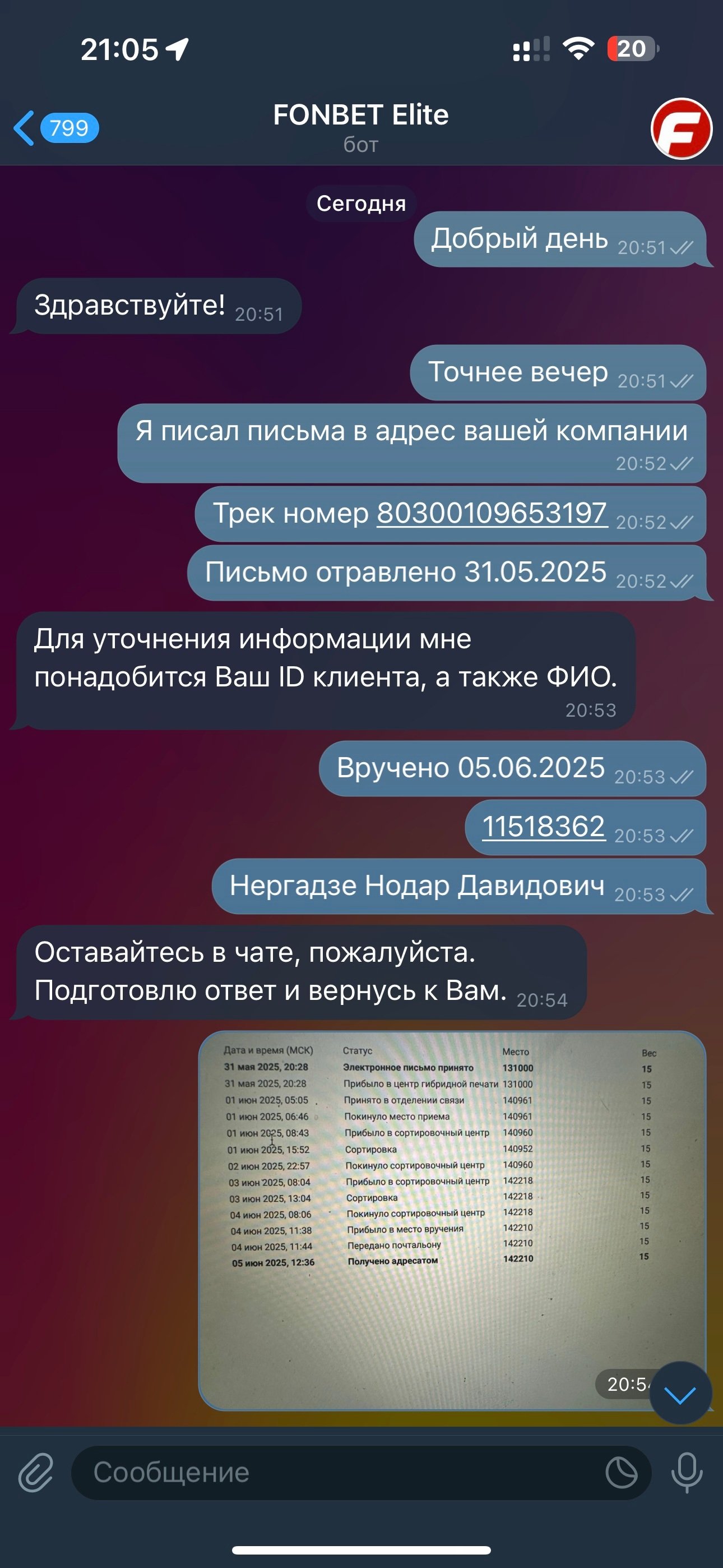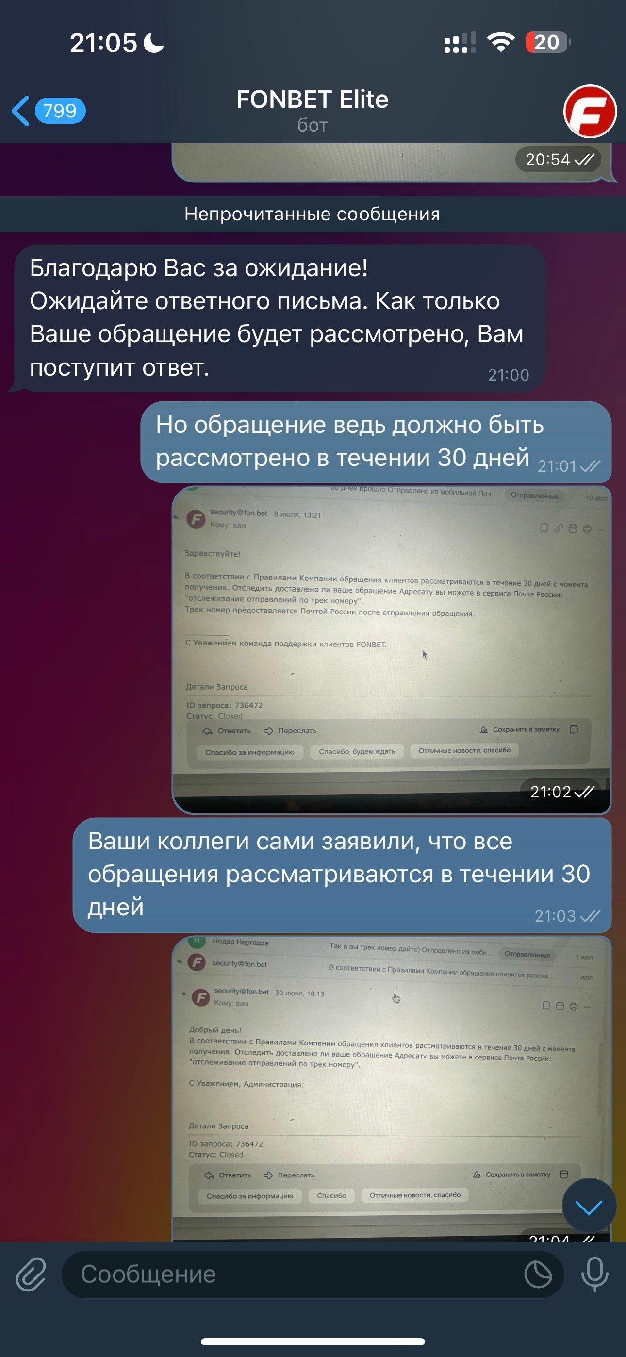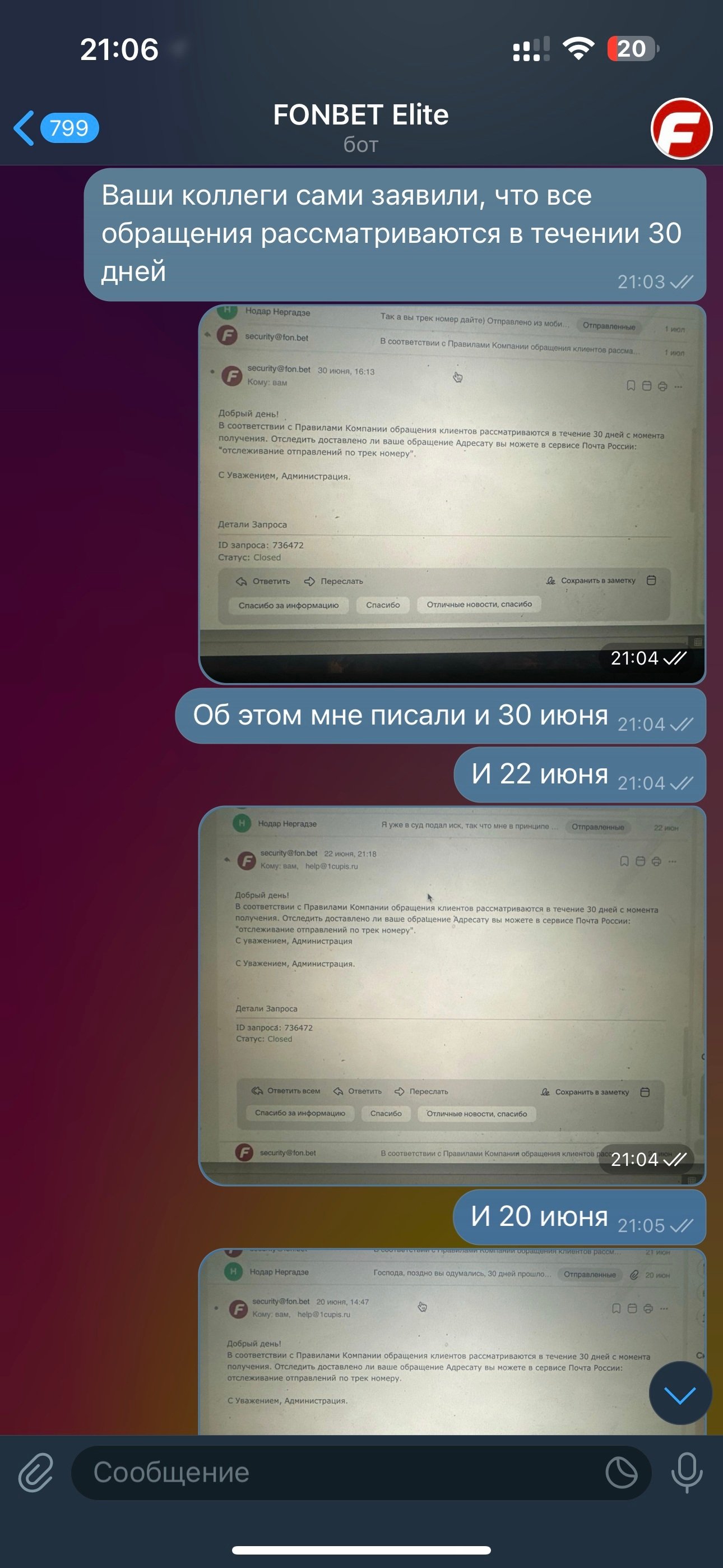 Обратился к администрации по почте , тема обращения - Взломали аккаунт, написал по месту регестрации ООО Фонкор претензию по почте - трек номер 80300109653197 - статус письма вручено. Потом продублировал две претензии трек номер - 80546009451024, ответа не получил. С момента первого обращения прошло 58 дней. На аккаунте лежат деньги, доступа к деньгам не дают, на любые сообщения к администрации через электронную почту, они отвечают (все обращения пользователей принимаются только по почте России,) хотя сначала всю информацию запрашивали через электронную почту майл, потом решили затянуть срок перешли на почту россии, на вопросы предоставить трек номер с ответом на мою претензию отвечают так же! ( все обращения пользоватаелей принимаются только по почте России) срок установили сами 30 дней, прошло почти 60, как быть? как добиться правосудия ?