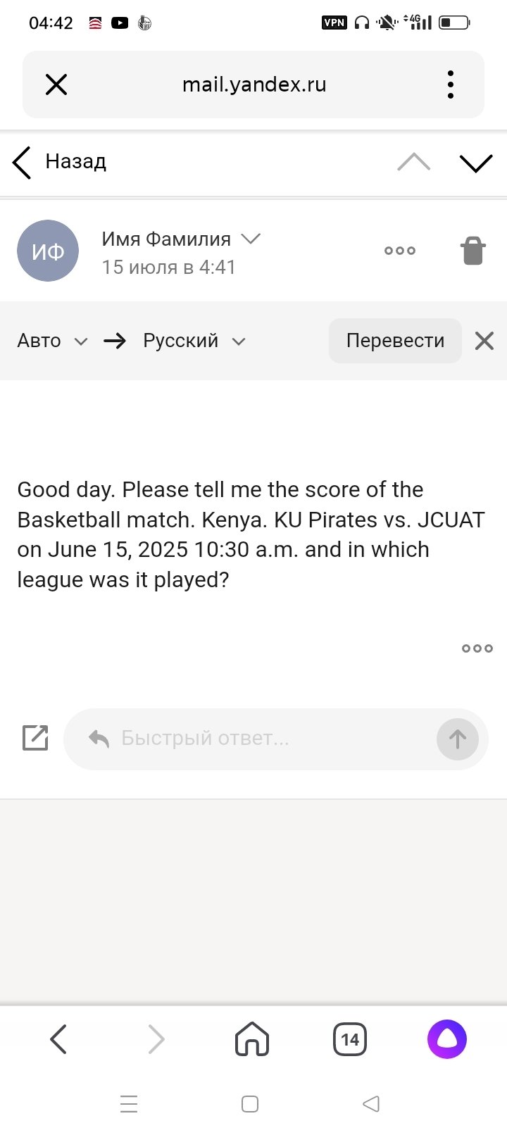 Вообщем продолжаю бороться за свои права. 1. Направил организатору матчей где играет команда на которое принято пари простой вопрос. Счёт матча и в рамках какой лиги сыгран. До 2022 года подобные вопросы порой отвечали быстро (часто в таких странах люди простые и отзывчивые). Письмо прошло. Жду ответа. Как будет, отпишу. 2. Нашёл одну из команд. Скрин прилагаю. У команды салатовый логотип. Ссылку на Лигу тоже прриложу. https://ksbcleague.com/standings/# 3. И ответ Букмекера (в стиле идите лесом). Источник не дают. На мой взгляд я предоставил исчерпывающие доказательства, что данный матч не имеет ничего общего с лучшей лигой Кении - Премьер лигой. Просто букмкеры вводят игроков в заблуждение. Я бы и сам не ставил на низшие лиги третьисортных чемпионах. Так как там возможно всё.