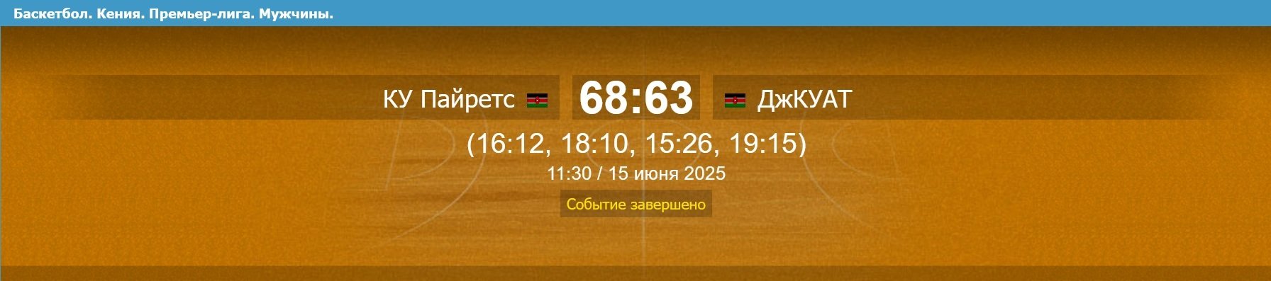 Прошу проверить информацию и отменить пари. Ставка 2283 была принята на несушествующий матч. Номер счёта 3646011 Баскетбол. Кения. Premier League Основные. Тотал (132.5) бол КУ Пайретс ДжКУАТ Завершен ( 68:63 (16:12, 18:10, 15:26, 19:15). В данной лиге Кения Премьер лига нет таких команд. В рамках данной лиги такой матч не проводился в этот день. Прошу сделать возврат. Пруфы прилагаю. Это официальный источник. Премьер лига Кении по баскетболу. Данного матча не было в 10:30 15 июня 2025Отмена.