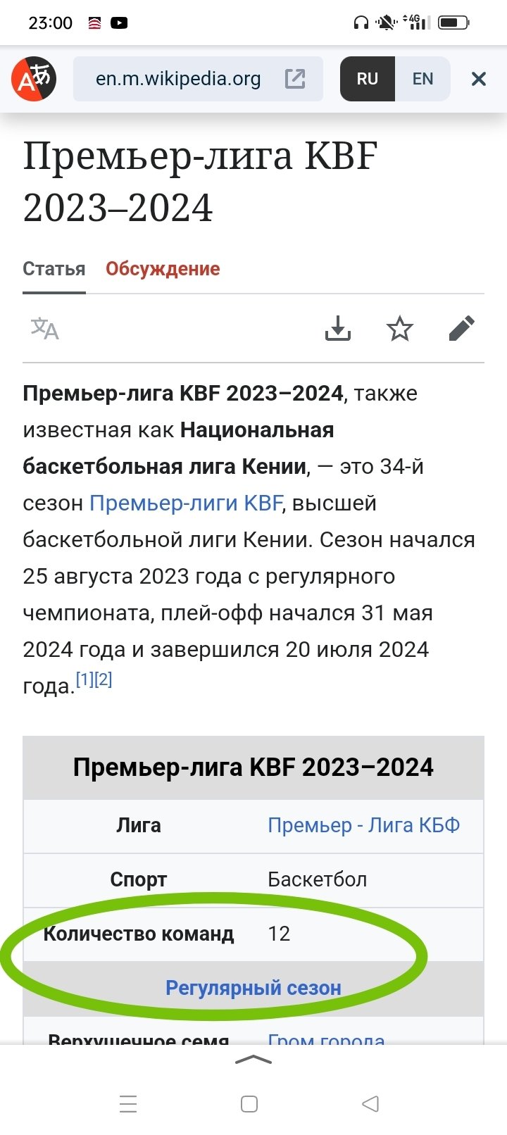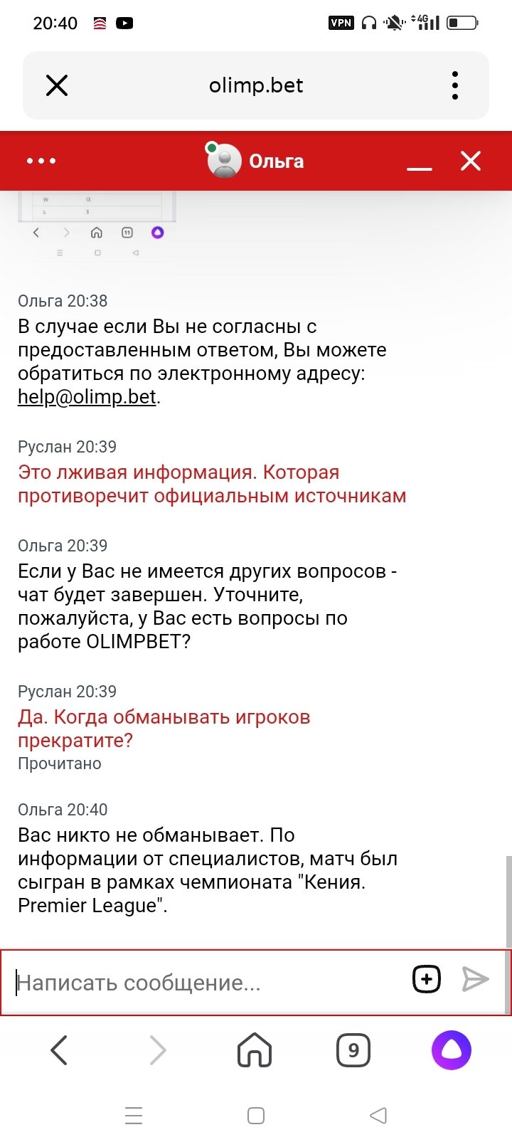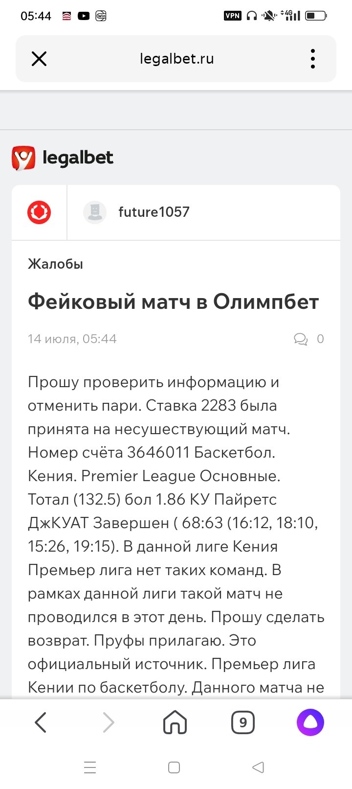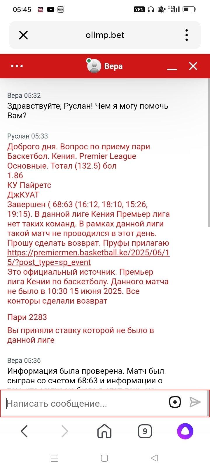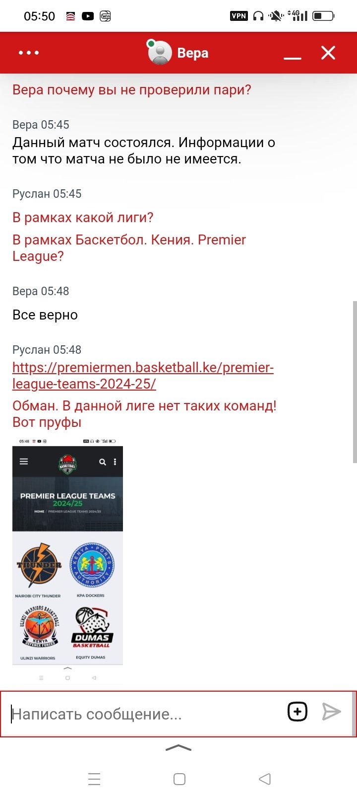 Вы грамотно разбирались. Я близкого к вашему мнения. Но я предоставил вам ссылку на официальный сайт именно Премьер лиги Кении. Продублирую: https://premiermen.basketball.ke/ Вот ещё официальный сайт Федерации баскетбола Кении: https://basketball.ke/ С федерации баскетбола Кении можно перейти на сайт Премьер лиги Кении. Я вам приложу скрин о способе аыбора и перехода. Там слева четкая иерархия обозначена. Мы выбираем Мужчины, Премьер лигу и переходим на сайт Премьер Лиги Кении. Там играет 12 ЛУЧШИХ команд этой страны. Команд. Подчеркиваю ЛУЧШИХ. И я хотел ставить только на высшие соревнования среди мужчин. 2. До того момента как я написал букмекеру о проблеме ещё можно было в теории принять что была ошибка и опечатка и что лига была другая. Но букмекер в чате подтвердил что это именно Премьер Лига Кении по баскетболу. Поэтому я требую возвоат пари с кефом 1. Я не заключал пари на низкие лиги. Мне это не нужно. И так это низкосортный баскетбол в целом (в данный момент в лайве был маленький выбор). Действительно вы правы данный матч был сыгран в одной из других лиг. Но не Премьер лиги. 3. Допустим в России есть высшая лига и она называется РПЛ, а есть ФНЛ и т.д. аналогия. Букмекер принимает деньги у игрока и должен четко отвечать на вопросы игрока и названия должны соотвествовать. 4. Данные на любительских сайтах носят поверхностный характер. А у других букмекеров я не ставлю. А играб именно в Олимпе и с него требования. Если бы не ьыло официального источника косвенная информация была бы уместна, но я вам предоставил максимальные доказательства. В Премьер Лмги Кении по баскетболу данный матч в 10:30 ч не проводился и ставка подлежит отмене. Кроме того обратите внимание на время. Матчи премьер лиги Кении не проводятся в столь ранее время, в 10:30 утра. В это время играются более низшие лиги. Если букмекер откажет, то точно буду писать досудебную претензию. И всё это происходит именно за счет того что в России нет ни одного ресурса, который мог бы быть объективен и помогал игроку. Я изложил доводы максимально понятно. Это уже 3 иои 4 жалоба на данного букмекера. 6. В рамках данного матча Букмекер ещё и поменял тотал у меня. Я ставил на 130.5 больше, но прошло около минуты была забита трёха и букмекер поменял тотал в карточке в момент приема на 2 очка, которых как раз не хватило в итоге. Хотя у всех букмекеров актуальный тотал был 130.5, так как команды сыграли около минуты в 4 четверти. Тут два основания для возврата: неактуальный тотал (132.5 вместо 130.5) и то что матча в рамках данной лиги не было. В настройках после этого пари я поменял потом и запретил принимать с изм. тоталами и форами. Ставка принималась кпк всегда 18 секунд, не меньше.