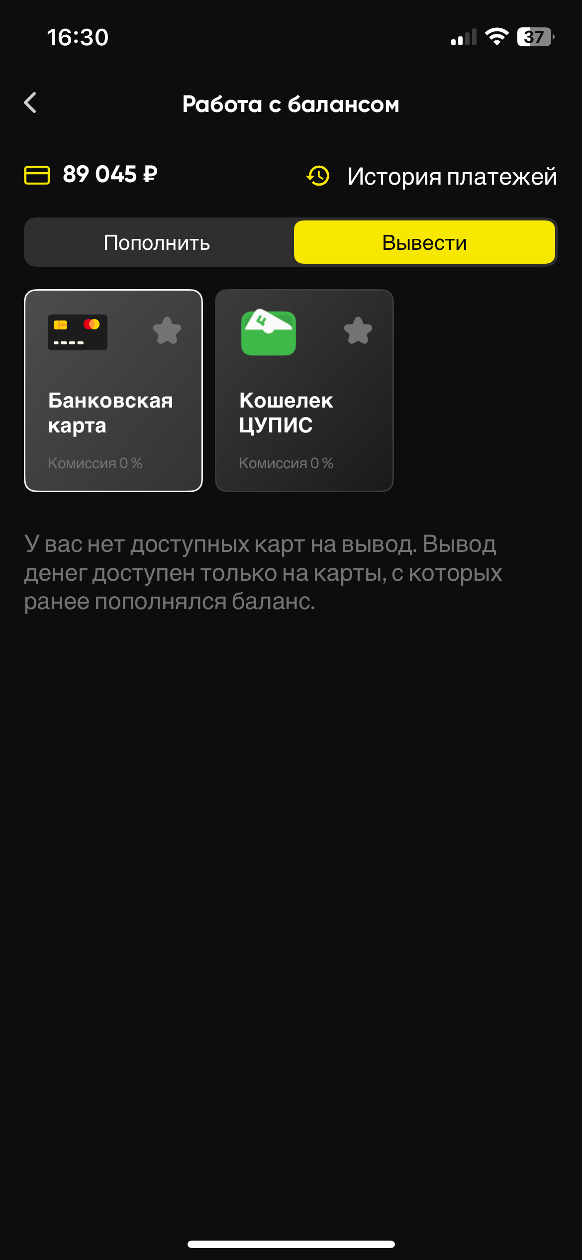 Верификацию прошел, спасибо большое за содействие. Пришло сообщение о необходимости нового запроса на вывод средств. НО мне теперь пишет что нет привязанных карт для вывода средств. Решил пополнить на 100 рублей (чтобы «привязать» карту, ТУ ЖЕ самую что и была привязана ранее). Деньги пополнились , но все равно указано что карты не привязаны. Скриншот приложил. Прошу помощи разобраться.