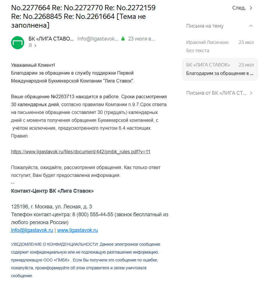 Отписки, шаблоны, отписки. Хочется чтобы люди на таких примерах, подобных мне и другим людям, видели как БК обращается с игроками и что ни в коем случае не стоит заводить деньги к таким букмекерам. Результат данной ситуации покажет who is who.