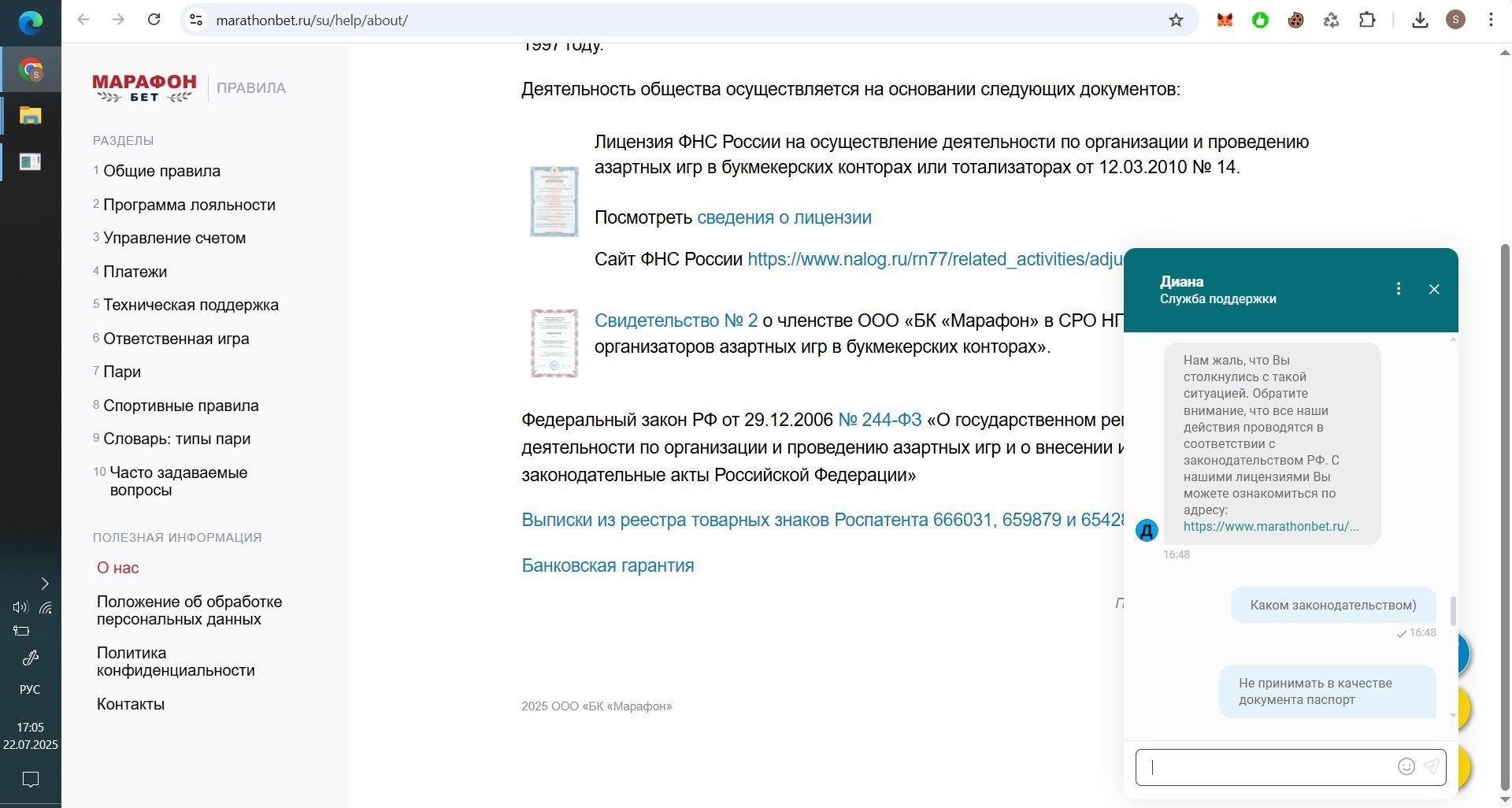 Более подробную информацию по ситуации Вы уже получили на электронную почту, привязанную к игровому счету. Мы обращаемся к Вам с просьбой не создавать дубликатных игровых счетов в БК «Марафон». Любые новые счета, созданные Вами, будут закрыты. Данное решение является окончательным, и мы не намерены вступать в дальнейшую переписку по поводу закрытия Вашего игрового счёта. Приносим извинения за неудобства и рассчитываем на Ваше понимание.