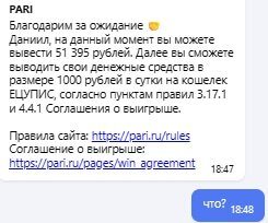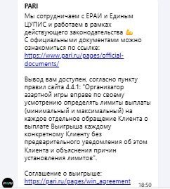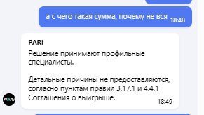 Здравствуйте! 19 июня 2025 года я закинул на счет в БК Pari 100 000 рублей с промокодом RS15, который обещал фрибет 15% (15 000 рублей). Фрибет не начислили! Написал в поддержку — начали тянуть резину, потребовали верификацию по пункту 3.4.1 Соглашения. Я сразу отправил все: паспорт, селфи с паспортом и листком с датой и фамилией, паспорт на просвет. Ждал 8 дней, и я уверен, что они даже не смотрели эти документы! Потом заявили, что нужна видеоверификация. Прошел ее, а в итоге — сплошной беспредел: вывод разрешили, но только по 1000 рублей в сутки (пункт .1 Правил, 4.4.1 Соглашения), а играть вообще запретили (пункт 3.5 Правил, Соглашения). Это что, мне свои 100 000 выводить 100 дней?! Фрибет так и не дали! Я не нарушал правил: пополнял со своей карты, никаких мультиаккаунтов. Эти деньги мне срочно нужны для важных семейных расходов! Это просто наглость! Прошу Арбитраж Легалбет содействию, чтобы Pari вывели мои 100 000 рублей без дурацких лимитов и начислить обещанный фрибет 15 000 рублей. Готов предоставить любые документы, лишь бы прекратить этот кошмар! Я видел, что вы решали уже такие проблемы, хотя бы дайте вывести средства. Номер счета(id): 64644629.