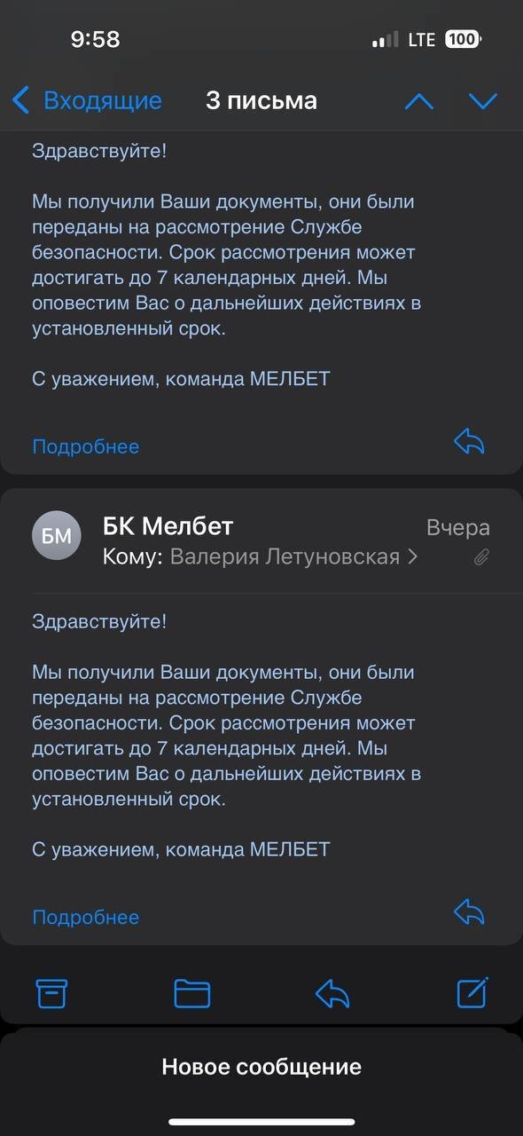 Я завела 10000 на мел бет, дабы получить бонус, и сделать ставку, поставила на коэффициент 1.4, выиграла 14000, после чего мне стали писать будто вывод недоступен, обратитесь в поддержку. В поддержке 4 дня говорили подождите и затем вообще закрыли доступ, на звонке говорят пишите на почту. Сейчас идёт 11 день, я скинула все фото что меня просили пару дней назад и никакого обратного ответа от них. Раньше отвечали на почте, теперь пропали. Помогите вывести свой депозит хотя бы 10000