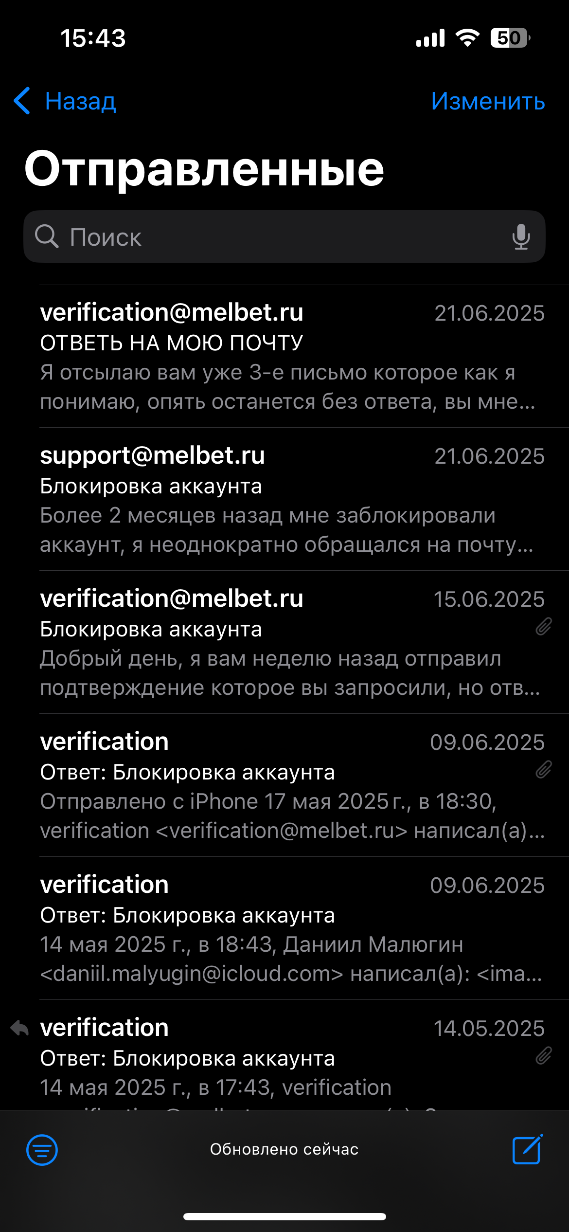 предоставьте доказательство, что был запрос и на какую почту, я вам прислал последние письма с почты verification@melbet.ru